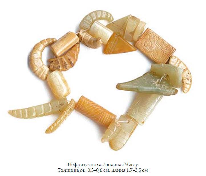 Среди подвесок - фигурки птицы, звериной головы, кузнечиков и гусениц шелкопряда с округлыми выпуклыми глазами.
