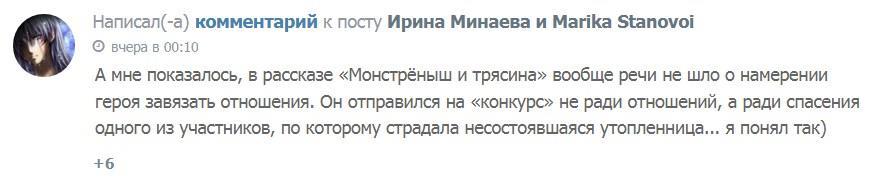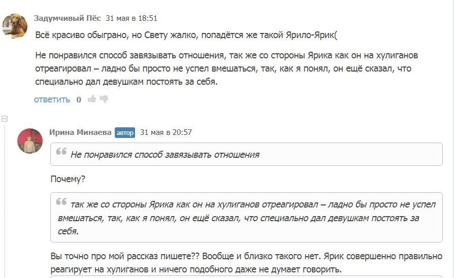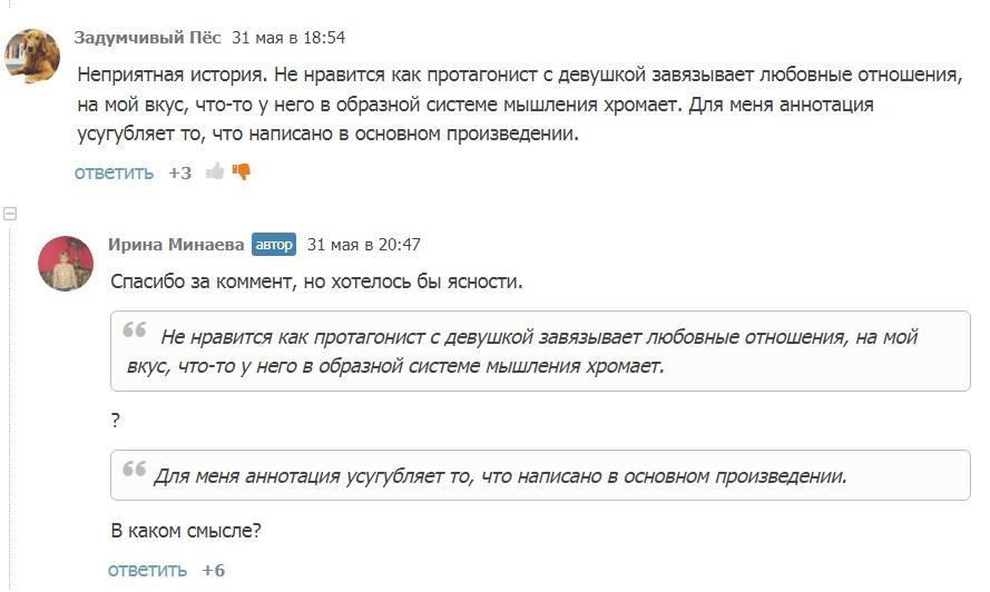 Собственно, я так всегда и делаю - пытаюсь выяснить, что конкретно не так, с точки зрения оппонента, почему он так считает и что может предложить для решения проблемы. Почему-то большинство таких "критиков" аргументировать своё мнение не желает, более того, в самых тяжёлых случаях они вообще на этом диалог прекращают, как это случилось совсем недавно после двух неадекватных комментов к двум моим рассказам. Вот, к примеру, первый: