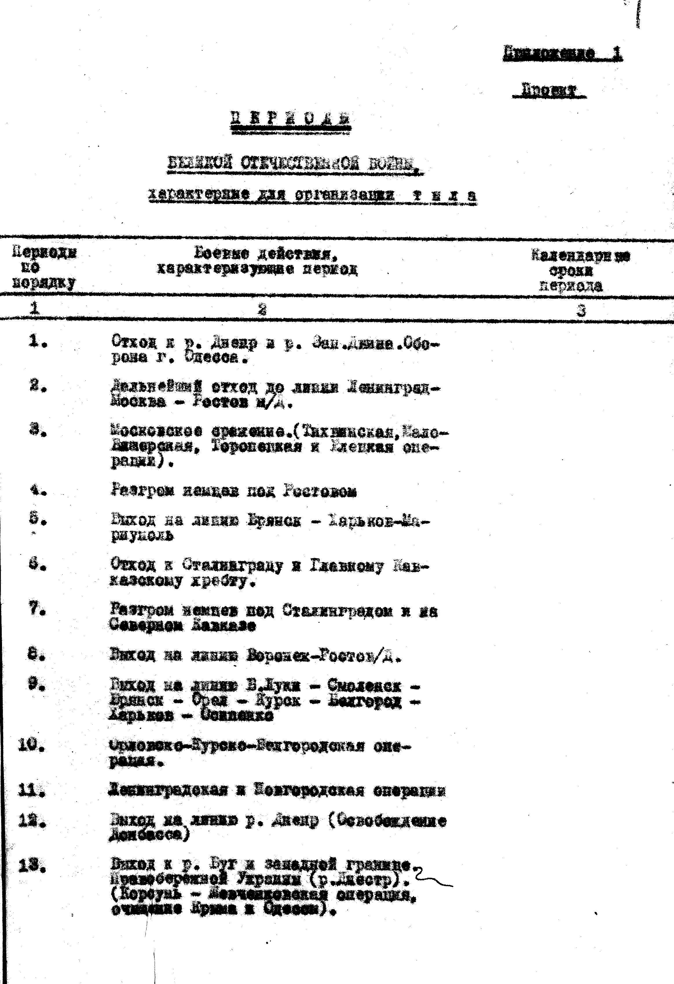 В заголовке документа написано, что речь о периодах, характерных для организации тыла. Может Генеральный штаб или другие центральные органы управления руководствовались другими указаниями и иначе подходходили к определению периодов? Сомневаюсь. Возможно, перечень и мог быть больше, но в основе должны быть те же самые сражения, боевые действия. Иначе невозможно будет свести воедино результаты работы всех структур Наркомата обороны. Получится, что Генштаб пишет об одном сражении, а сведений об организации его снабжения, проблемах, наличии танков, самолётов и прочего - у него нет. Или наоборот, интенданты рассказывают о том, как они обеспечивали разгром немцев под Ростовом-на-Дону, а ГШ об этом сражении нигде не упоминает.