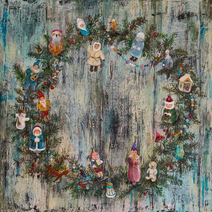 А этот венок, нарисованный художницей, меня тронул из-за игрушек. Они точь в точь такие, как в моем детстве. Уже тогда многие из них были не такие яркие и целые, как на картине, но я их всё равно очень любила!