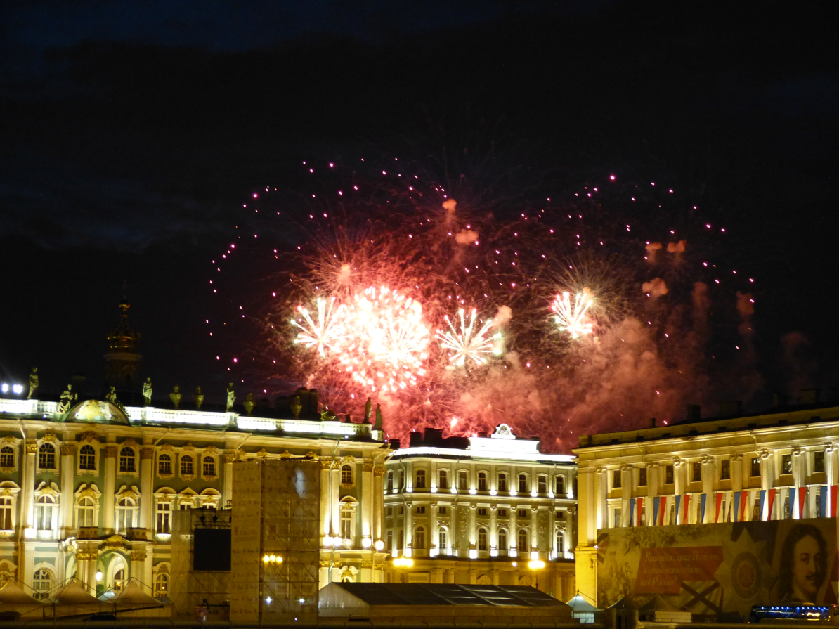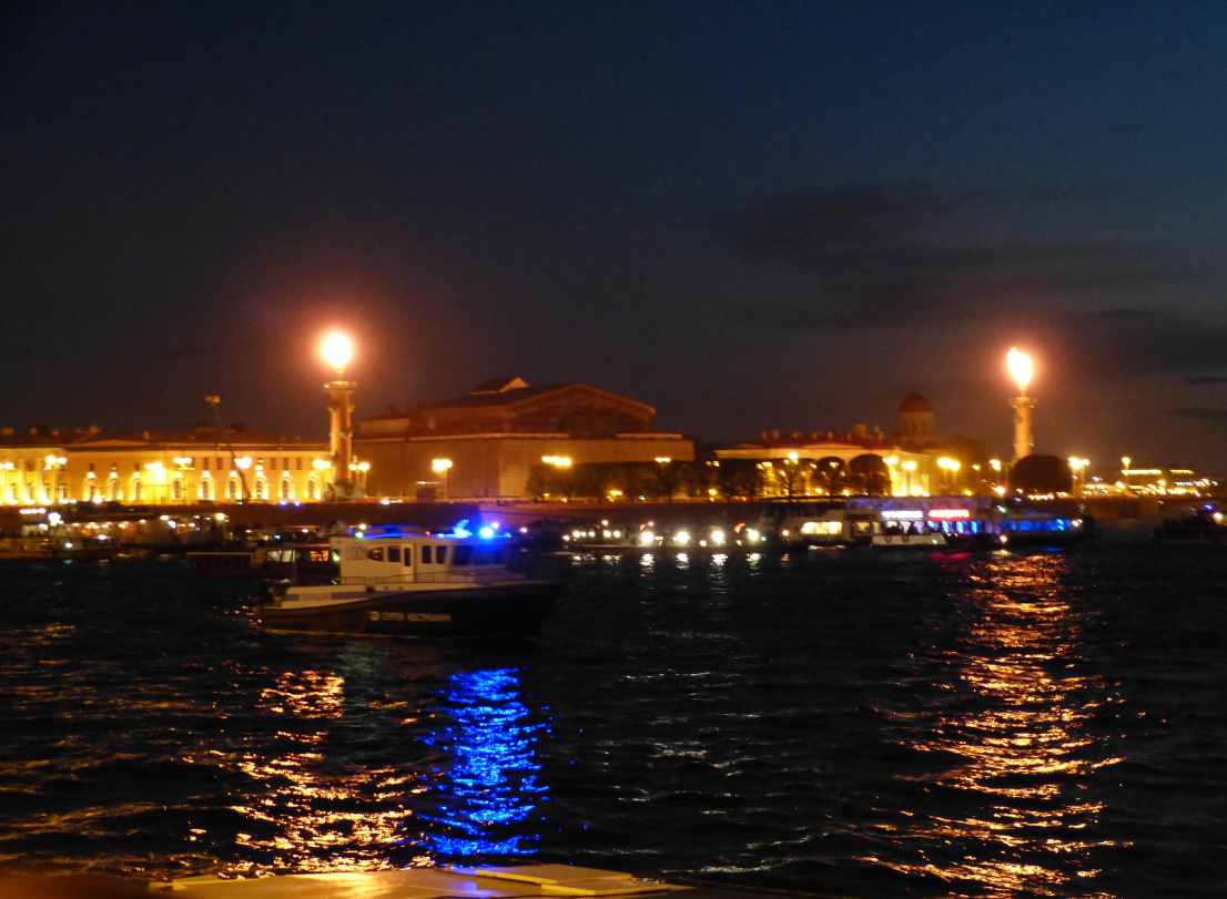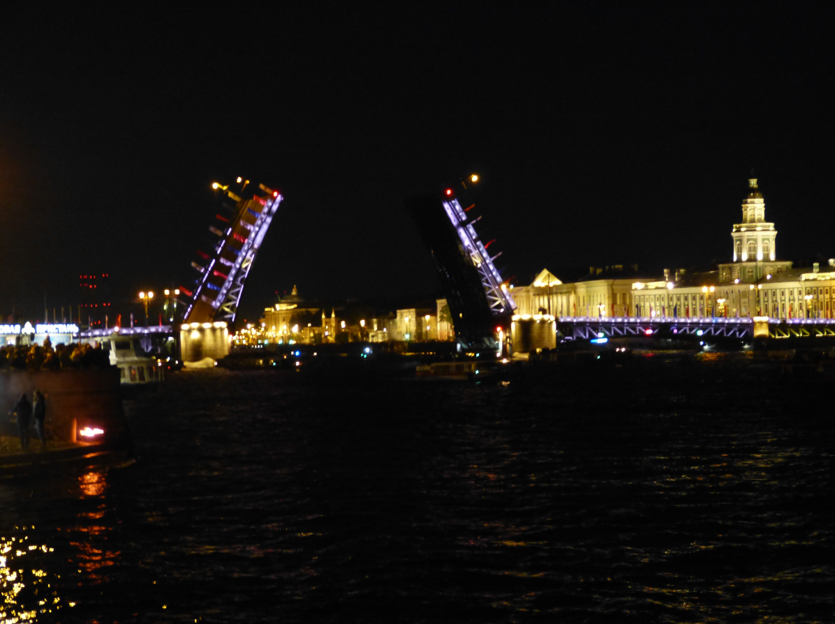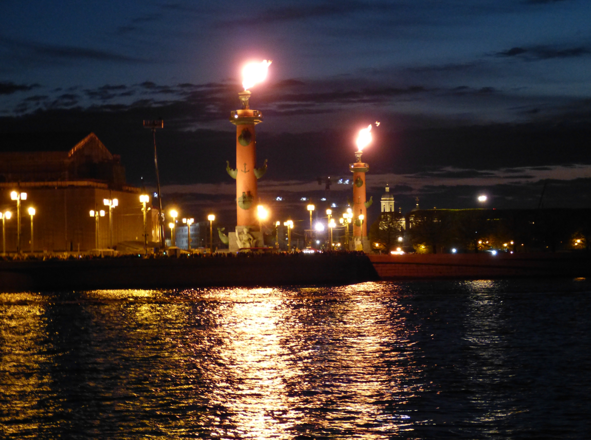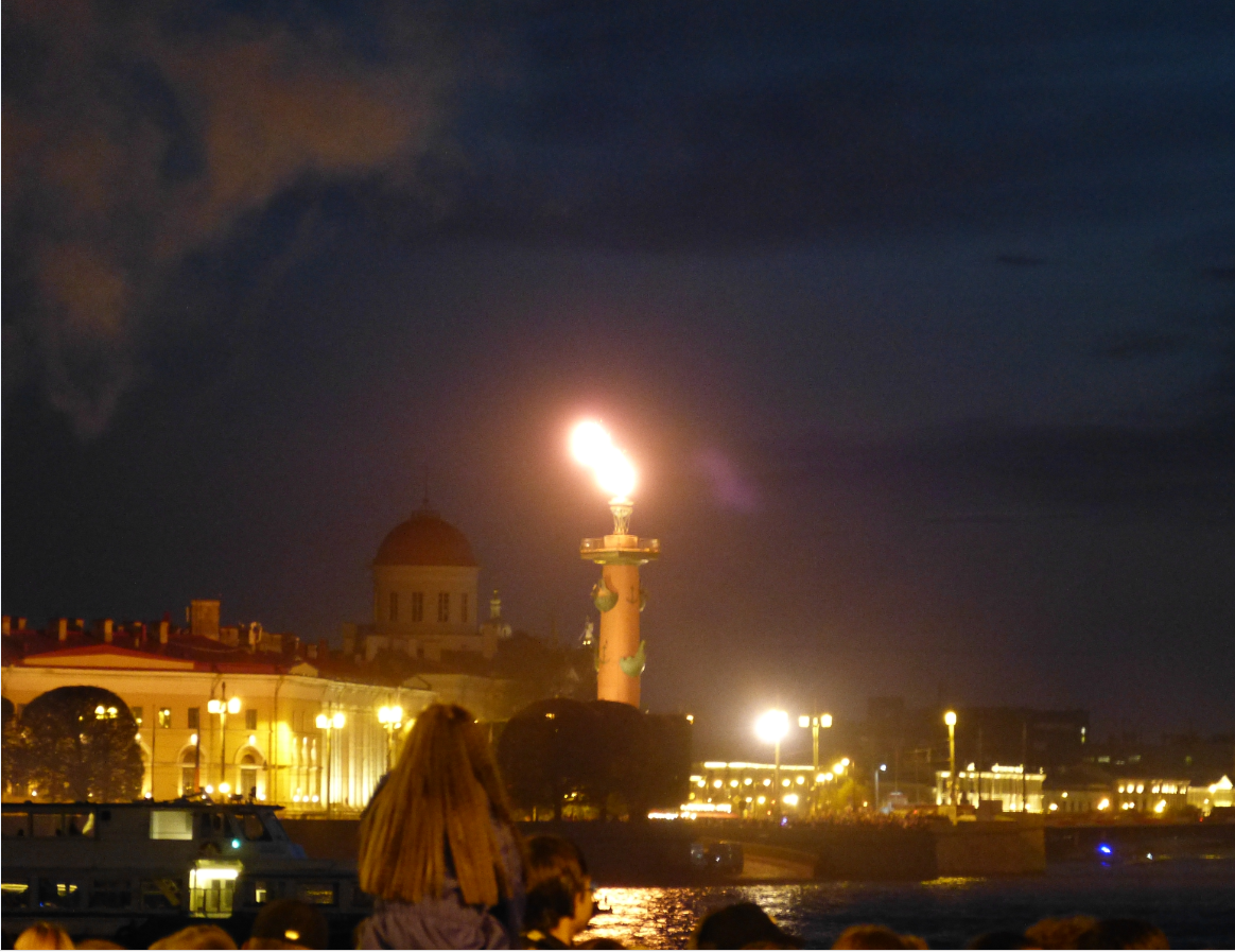 На ростральных колоннах зажгли факелы, после чего начали разводить мост и запускать фейерверки.