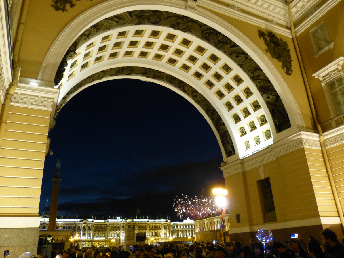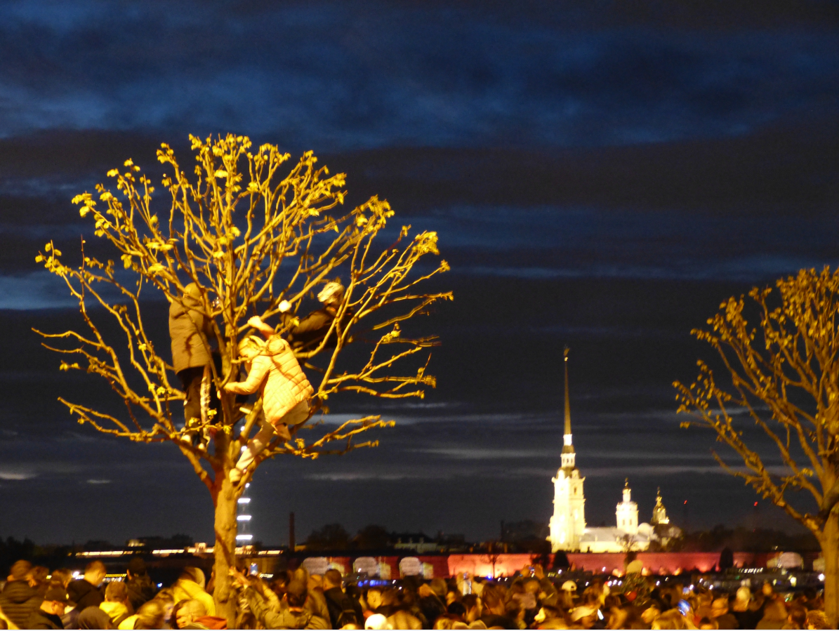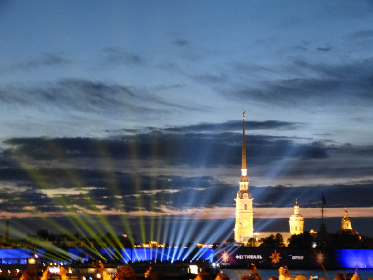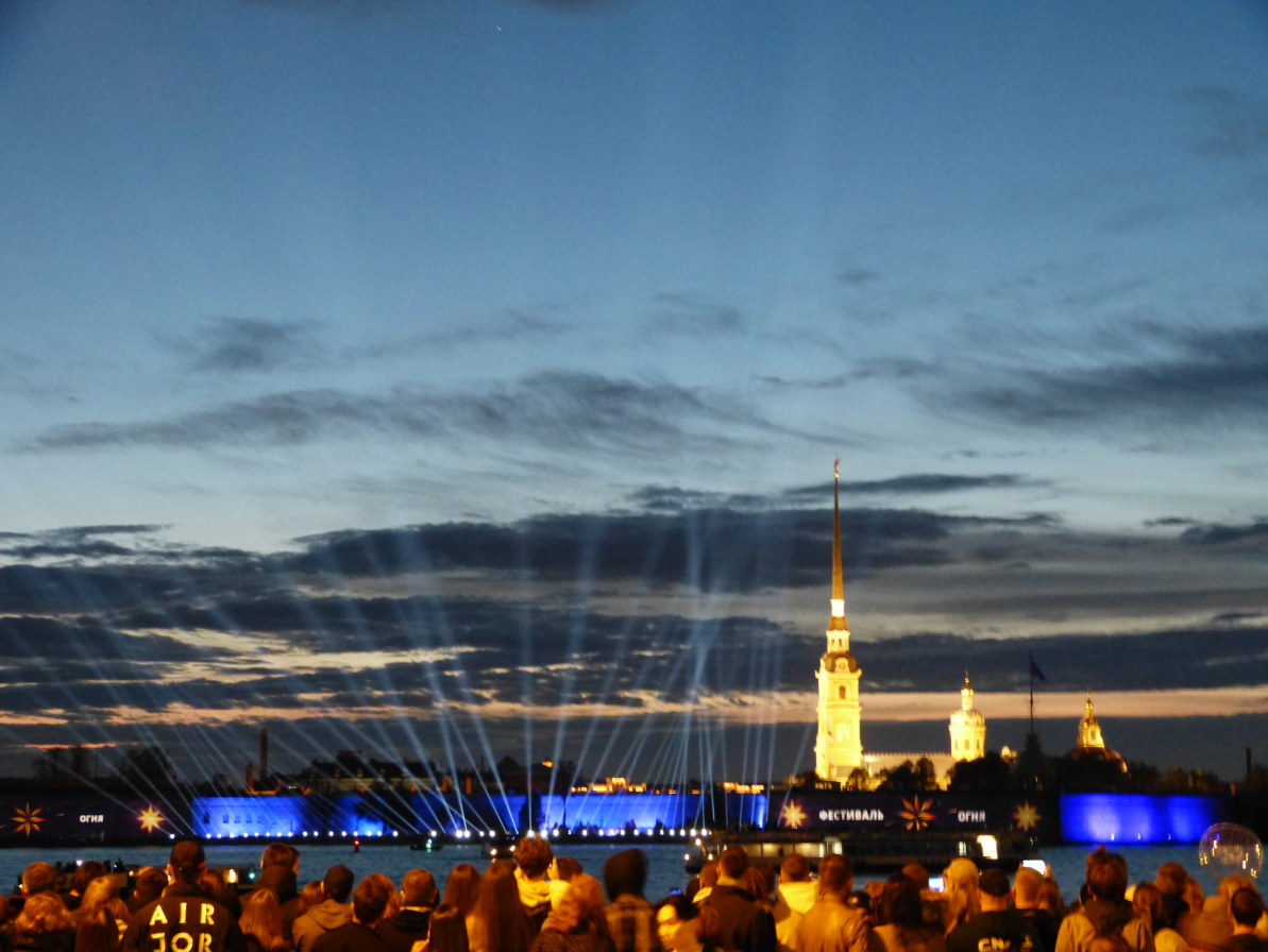 На стенах Невской куртины, а также Государева и Нарышкина бастионов, проецировали движущиеся картинки. Потом включили мощные прожектора, прочертившие ночное небо паутиной света.