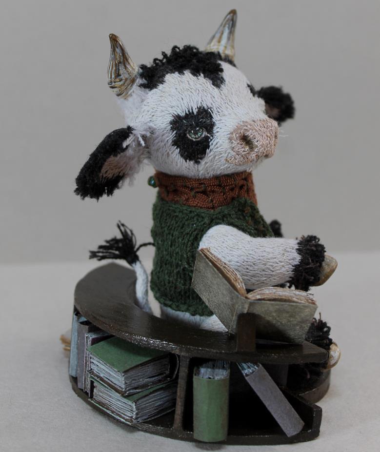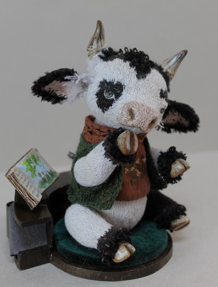Живёт у меня на столе для поднятия настроения. Пятнадцать сантиметров высотой, выкройки авторские, вышивка по льну, хвост-уши на проволочном каркасе, лапы-голова вертятся, лепные детали из LaDoll, стул-подставка из переплётного картона, глаза ручной работы, всё сама, всё сама.