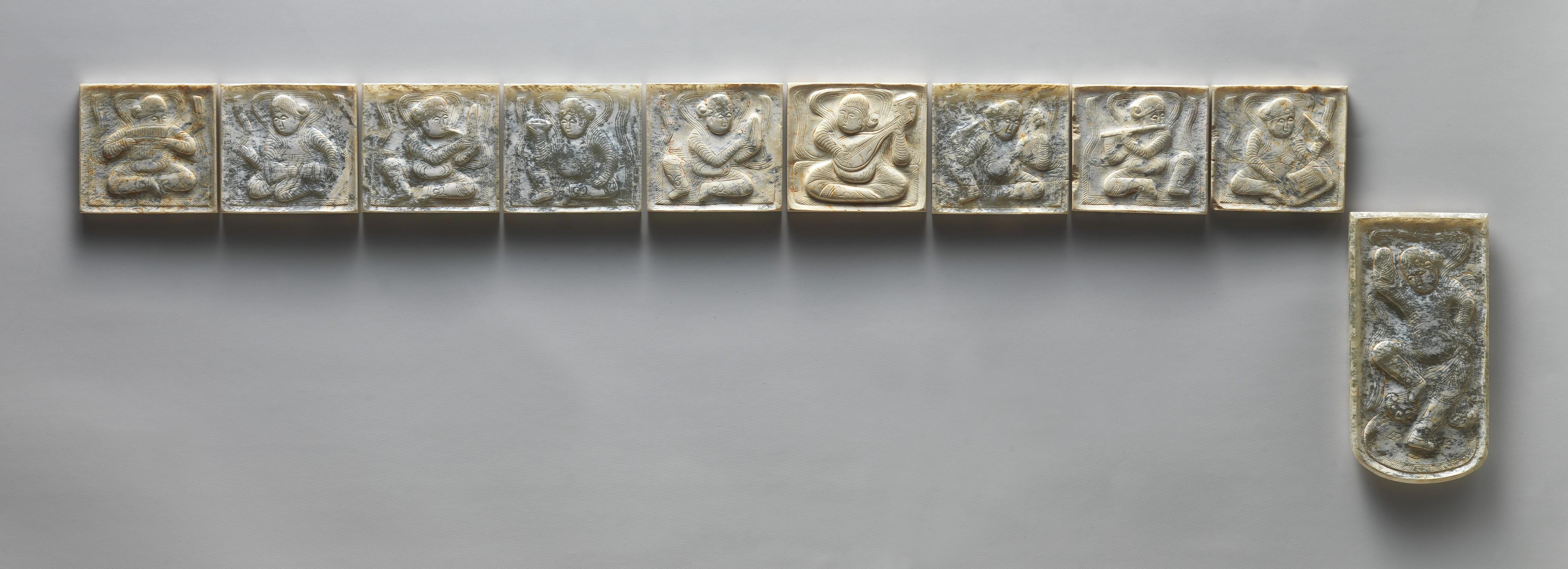 ✪ Набор нефритовых накладок на пояс (7 - нач. 8 в.) (Хотан, Таримский бассейн) с вырезанными музыкантами и танцорами, очевидно, уроженцами Средней Азии. (из коллекции Музея Искусств Метрополитен, Нью-Йорк)