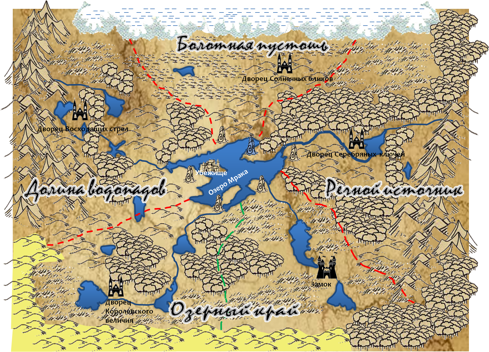 Озерный край разделен на две частично независимые части: Замок и «королевский двор» (именно так в кавычках и с маленькой буквы). Каждая часть имеет своего правителя.