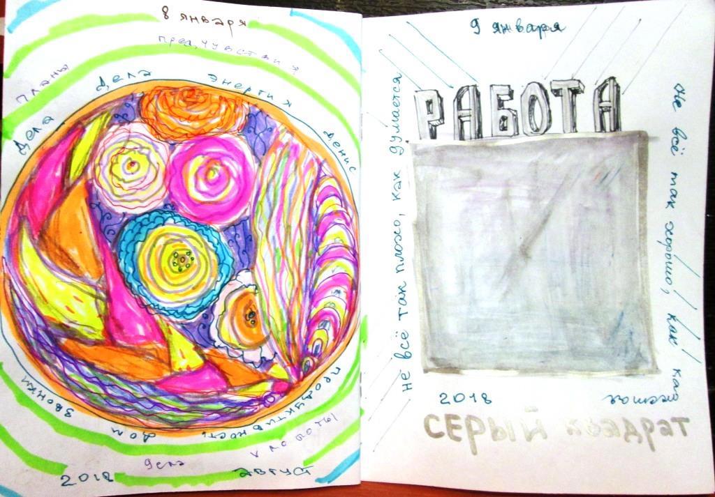 Бумага в тетради хоть и напоминала белый альбом, оказалась слишком тонкой для акварели и краска проникала на другую сторону, маркеры тоже, поэтому стала чаще использовать коллаж.