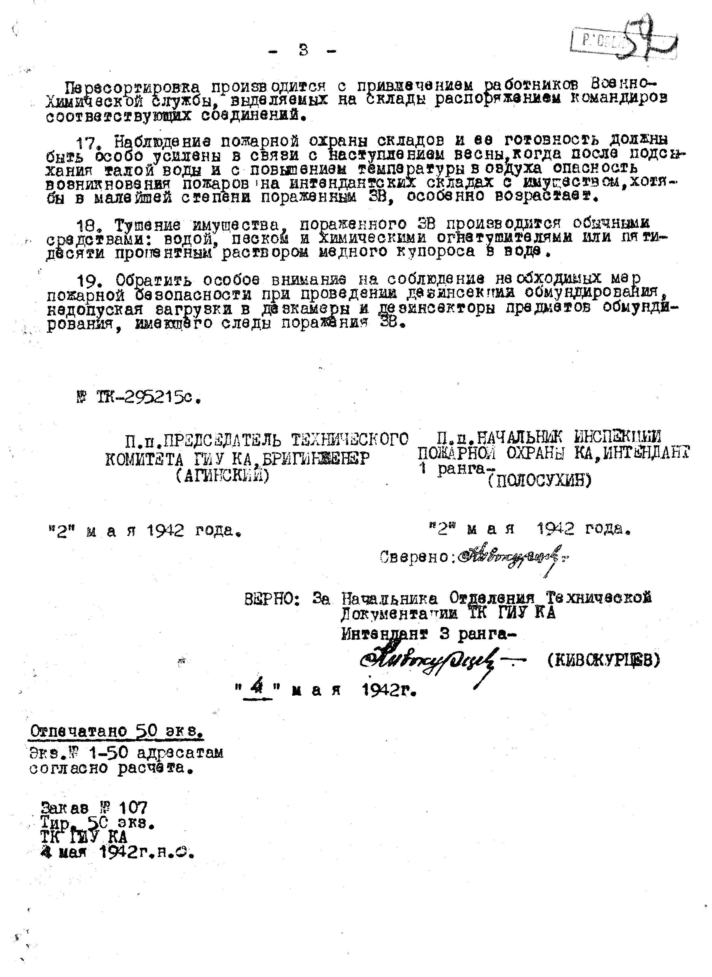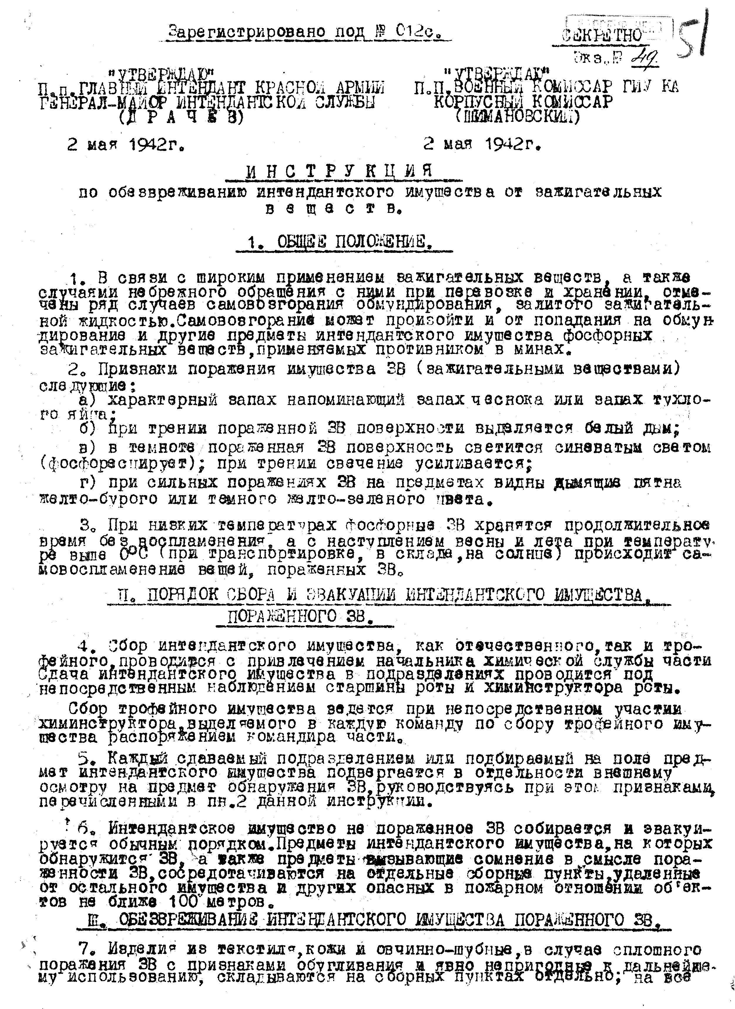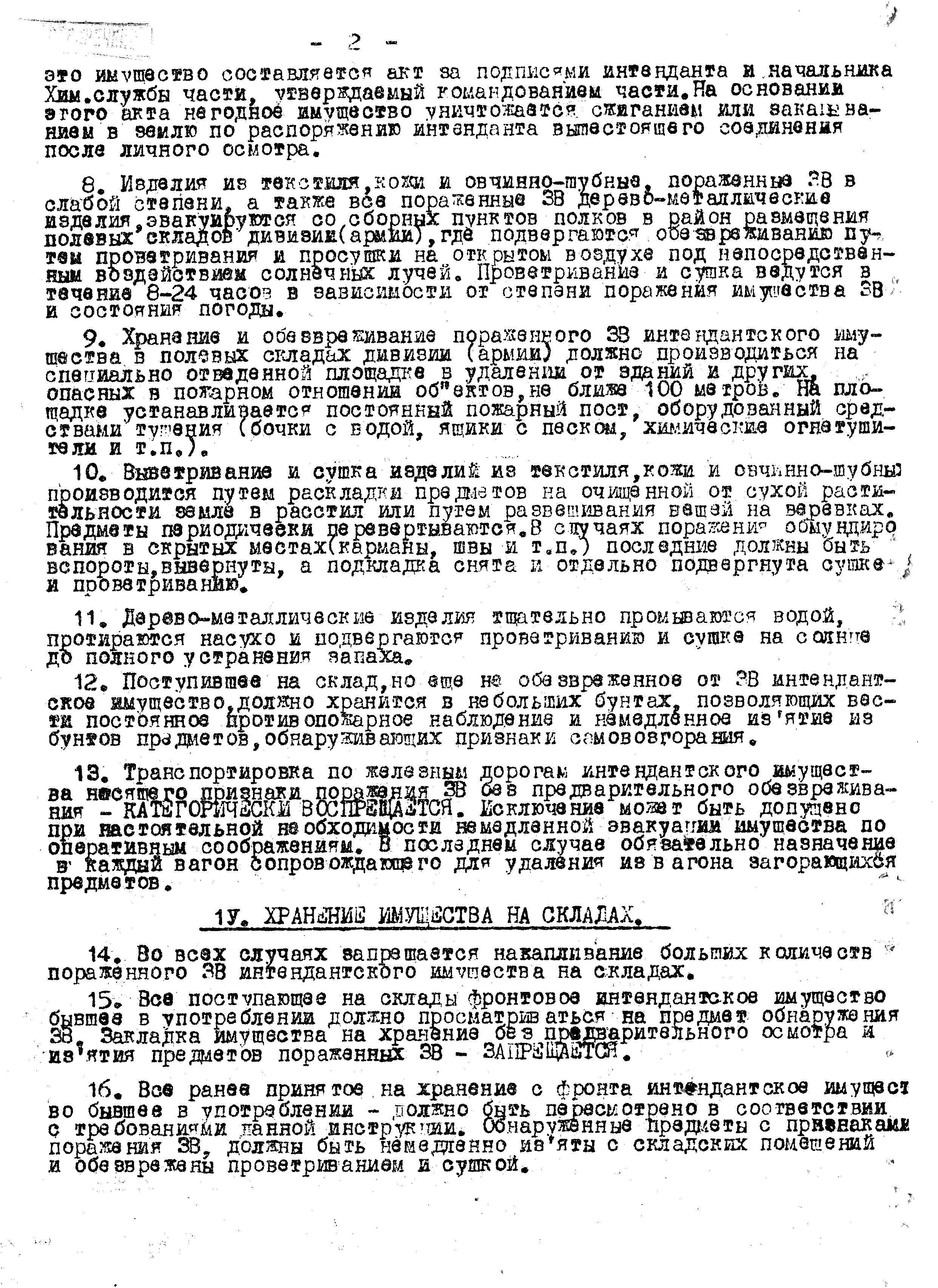 Достаточно быстро удалось выявить основные признаки поражения имущества зажигательными веществами, и в мае 1942г. Главное Интендантское Управление Красной Армии направило в войска инструкцию по обезвреживанию имущества от зажигательных веществ: