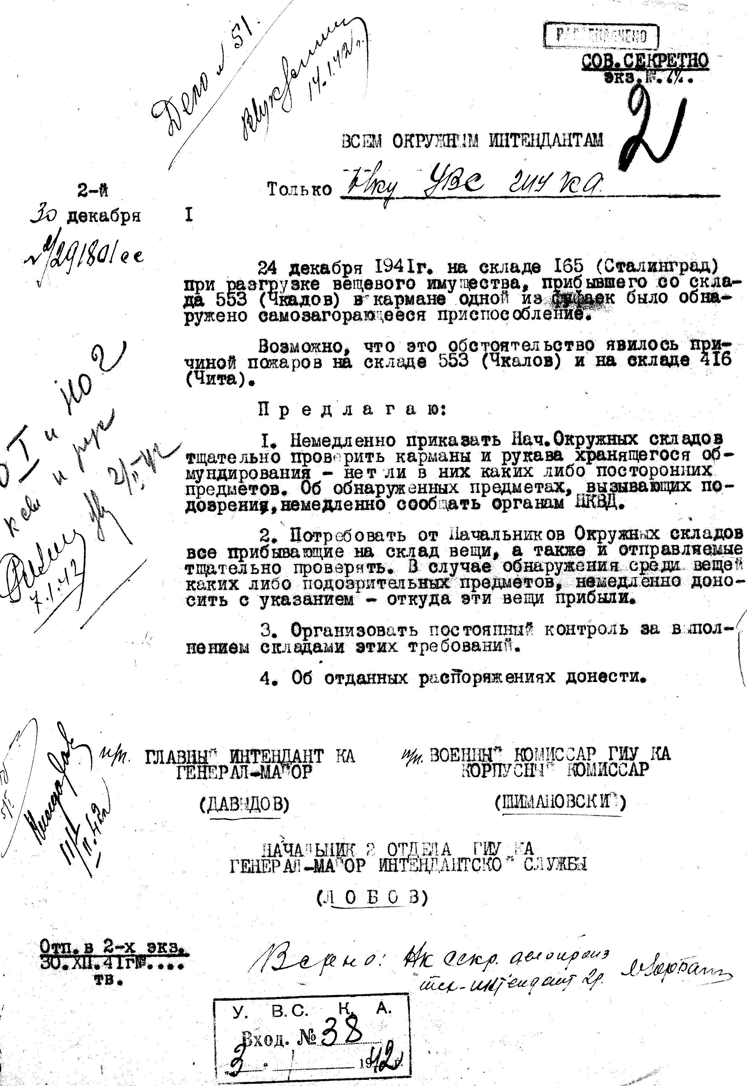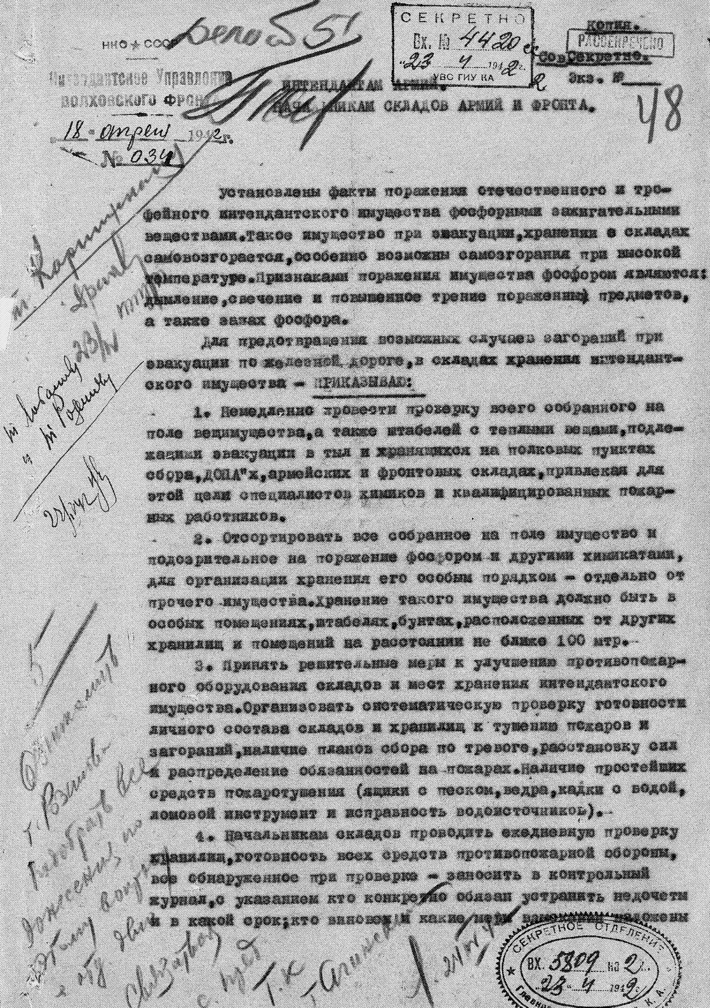д/с: Приказ интенданта Волховского фронта по предотвращению возможных загораний от самовоспламеняющихся зажигательных веществ