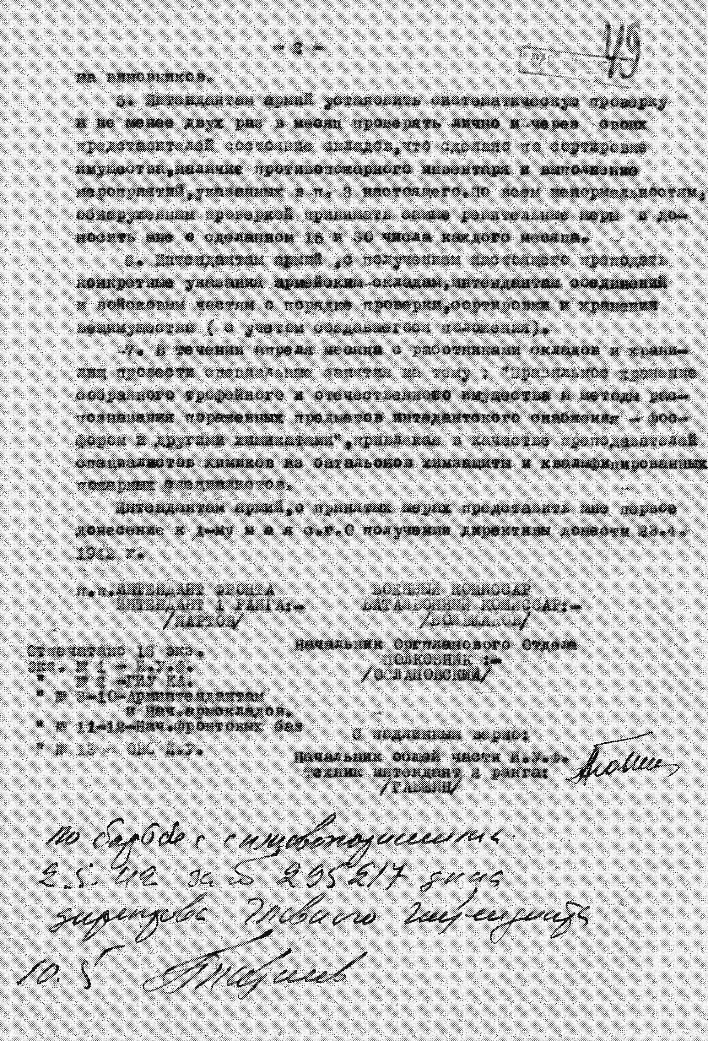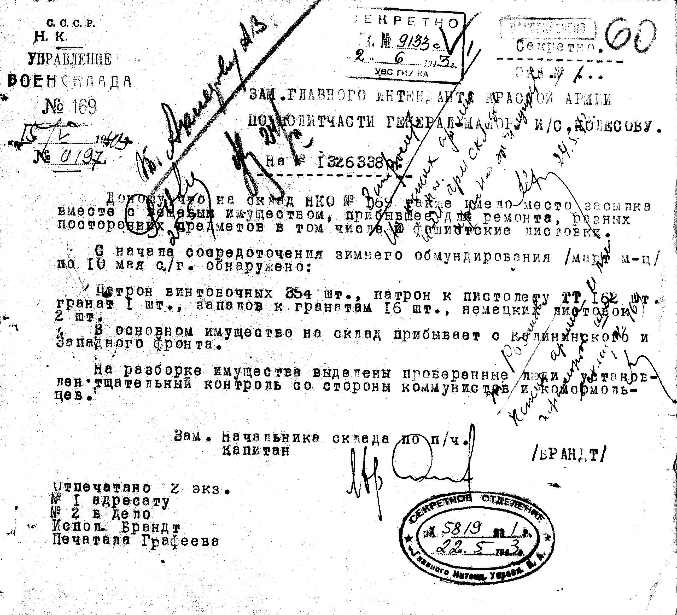 К примеру, доклад начальника одного из складов НКО об обнаруженных в карманах сданного для ремонта обмундирования патронах, гранатах и фашистских листовках:
