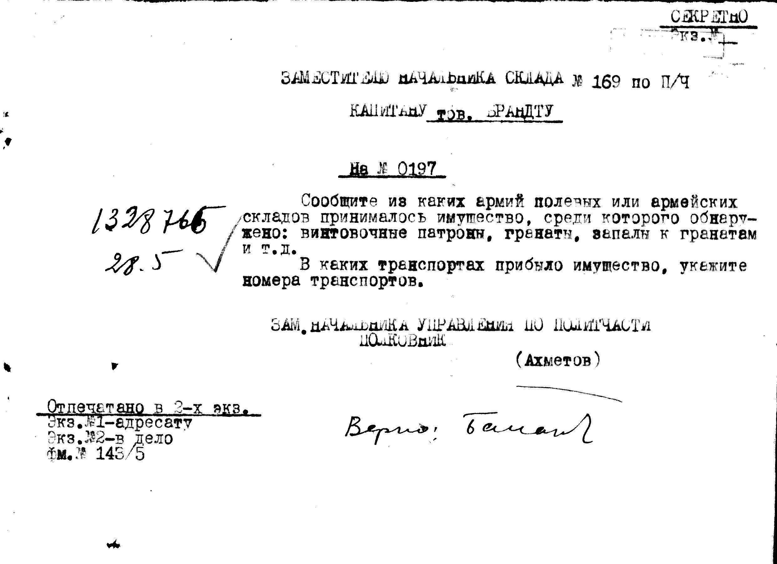 д/с: Доклад начальника 169 военного склада НКО об обнаруженных взрывчатых веществах и листовках![]()