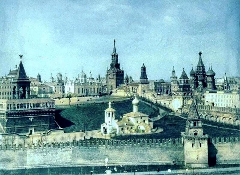 1908 год, Москва. Церковь Константина и Елены, мемориал Александру Второму, Николаевский дворец, Вознесенский и Чудов монастырь, в одном кадре присутствует почти все утраченное в Кремле 1918-1933 годах.