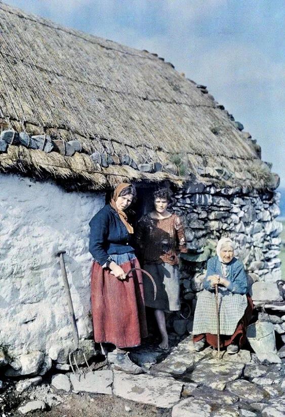 1927 год, Ирландия. Три поколения ирландских женщин у своего каменного домика (раскрашено).