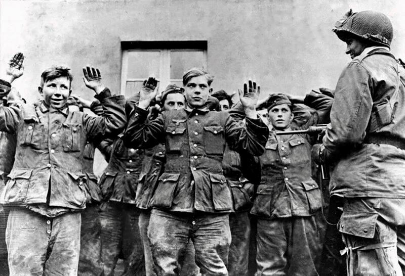 1945 год, Германия, Мюнстер. Рядовой Герберт Норман из 17-й воздушно-десантной дивизии США охраняет молодых солдат Вермахта, взятых в плен.