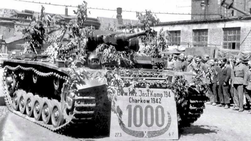 1942 год, СССР, Харьков. Торжественная передача тысячного танка (Pz.III), отремонтированного на заводе в оккупированном городе.