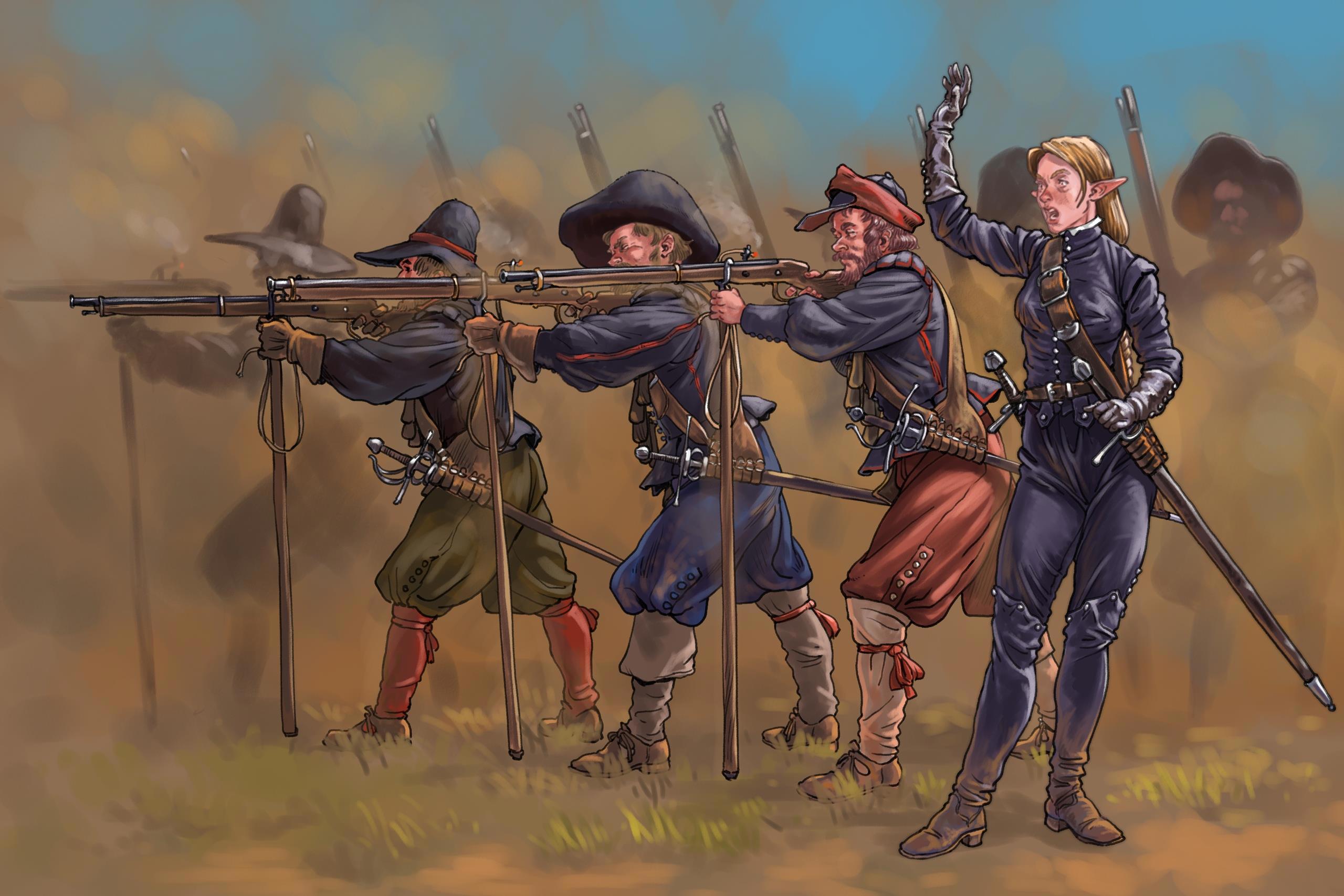Горнист заиграл звонкий сигнал, ему вторили ниже по склону. В считанные мгновенья приказ достиг войска. Фигурка Литэль двинулась - кажется, эльфийка вскинула скрипку и провела смычком по струнам. Взмахнула рукой и сделала первый шаг. Чёрная Гвардия мерно двинулась в наступление. С небольшим запозданием поползла вперёд и стена королевской пехоты. Издали она казалась внушительней войска мятежников - три огромных квадрата, несчётное море копейных наконечников. Уступавшие числом повстанцы растянули строй, чтобы не оголять фланги, а перед ротами пикинёров в несколько шеренг строились отряды стрелков. В центре остроухая леди-капитан собрала под своим командованием лучших солдат с мушкетами, по левую и правую руку от них расположились аркебузиры. У сторонников Огюста бойцы с ружьями тонкой цепочкой окаймляли баталии, иногда мелькая прямо среди копейщиков. За спинами гвардейцев кирасиры полковника де Больора перемещались на фланг, против которого разместились королевские жандармы.
