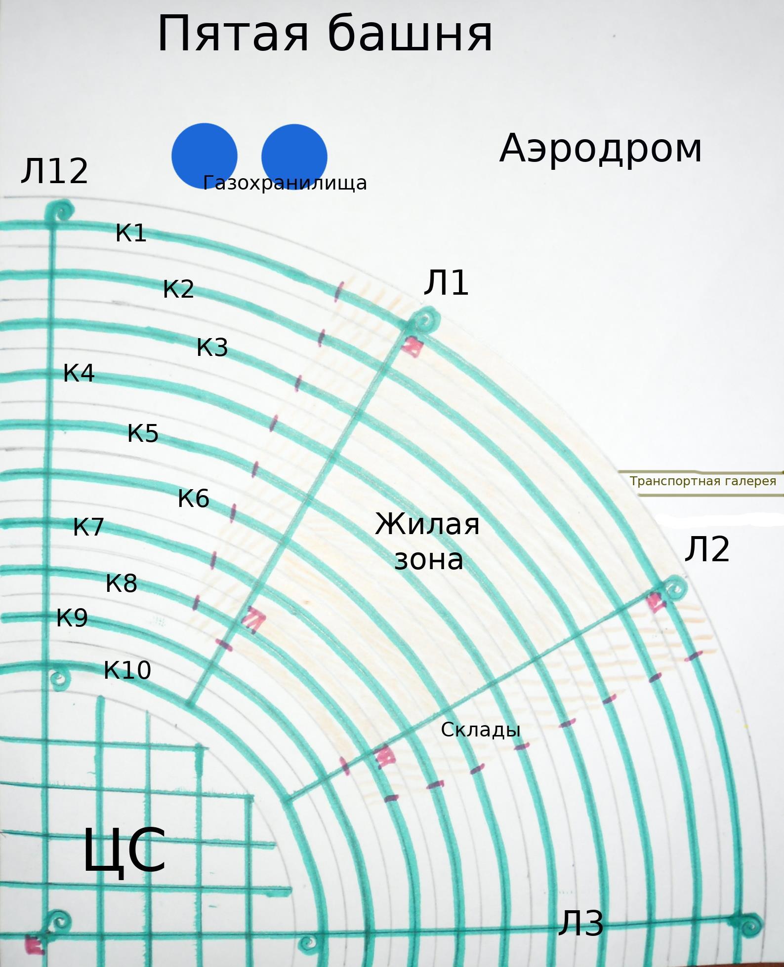 - Башня круглая. Её внешний контур — кольцо. И дальше, до самого ЦС, вся башня состоит из таких вот колец, пристраиваемых поэтапно, одно к другому. В результате должен получиться такой жилой бублик, с внешним диаметром полтора километра, толщиной пятьсот метров, с "дыркой" в центре. Только вместо дырки будет ЦС… Жилой бублик состоит из десяти колец. В центре каждого кольца — улица, а по обе стороны - жилища. Именно эти улицы и называются К1, К2 и так далее. Последняя будет К10. Каждая улица идёт по кольцу. Совсем недавно мы достроили восьмое кольцо. Сейчас начали девятое, а восьмое кольцо постепенно открываем для жильцов.