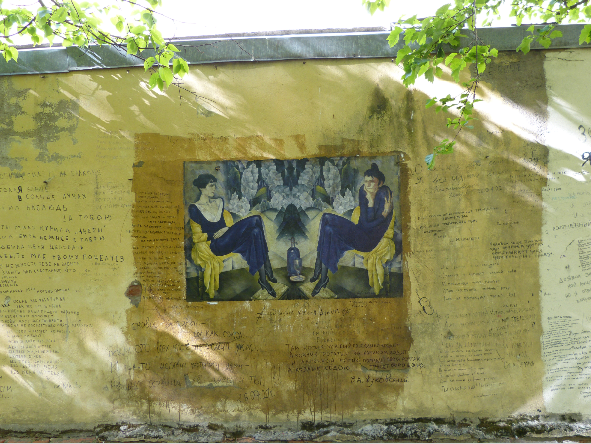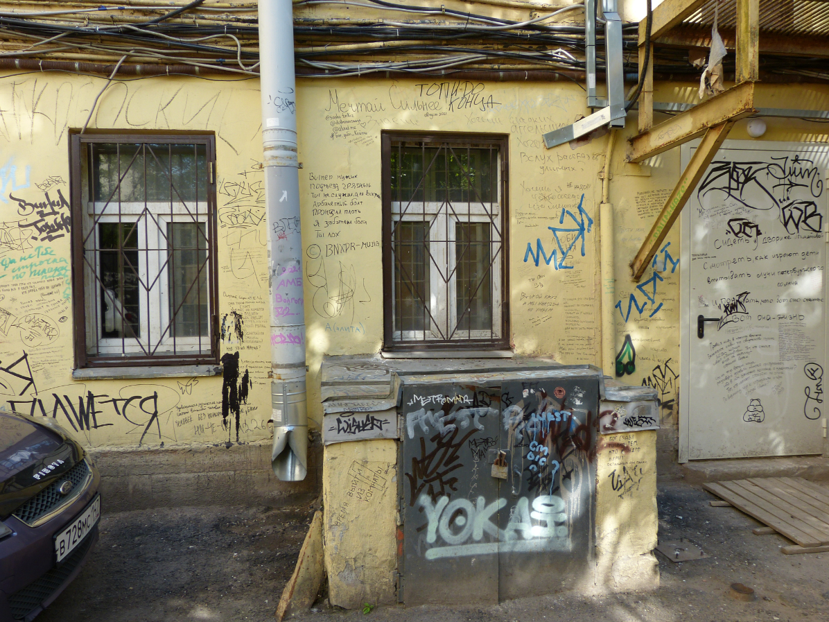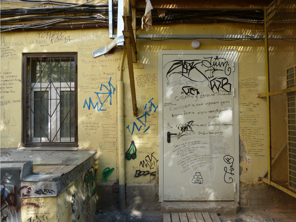 В Москве уже мало где пишут стихи на стенах, а вот в данном питерском дворике это стало традицией. Фанаты творчества Ахматовой и Гумилёва ежедневно добавляют новые строки. Местные власти периодически всё это закрашивают, но любители поэзии тут же пишут что-то новое.