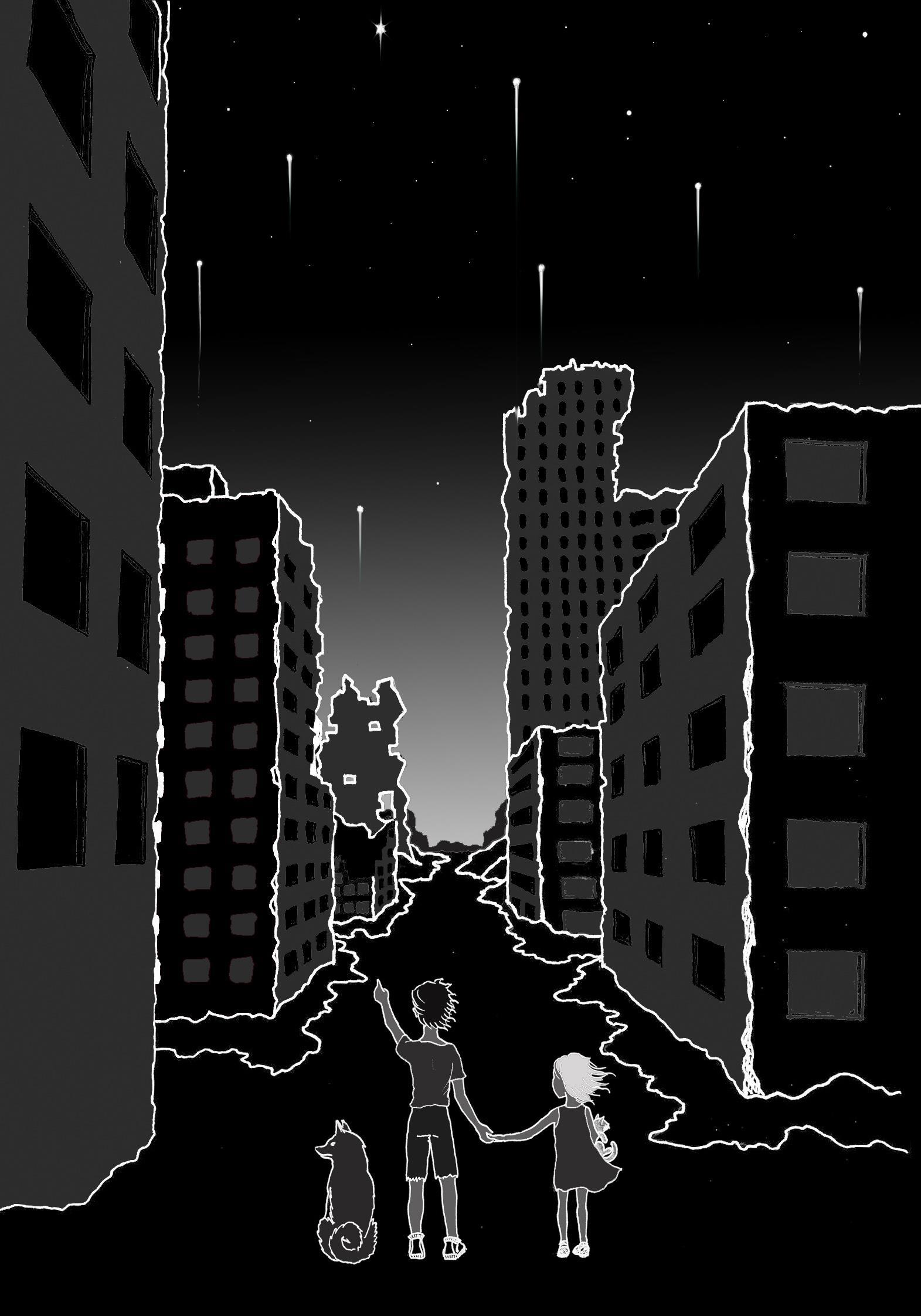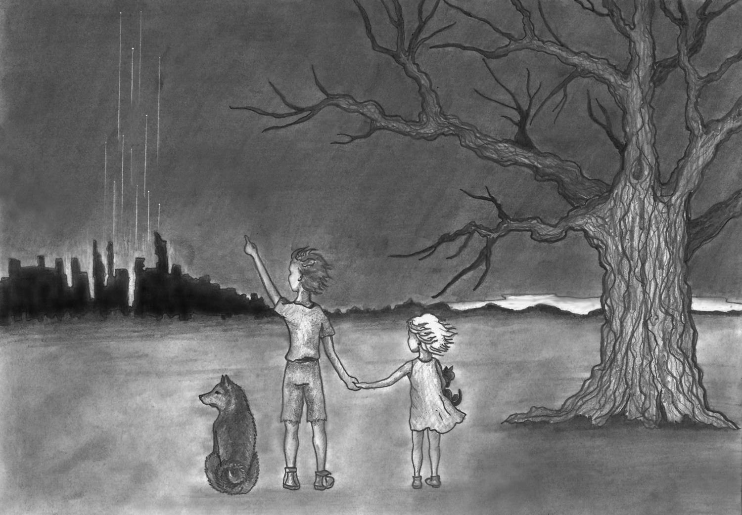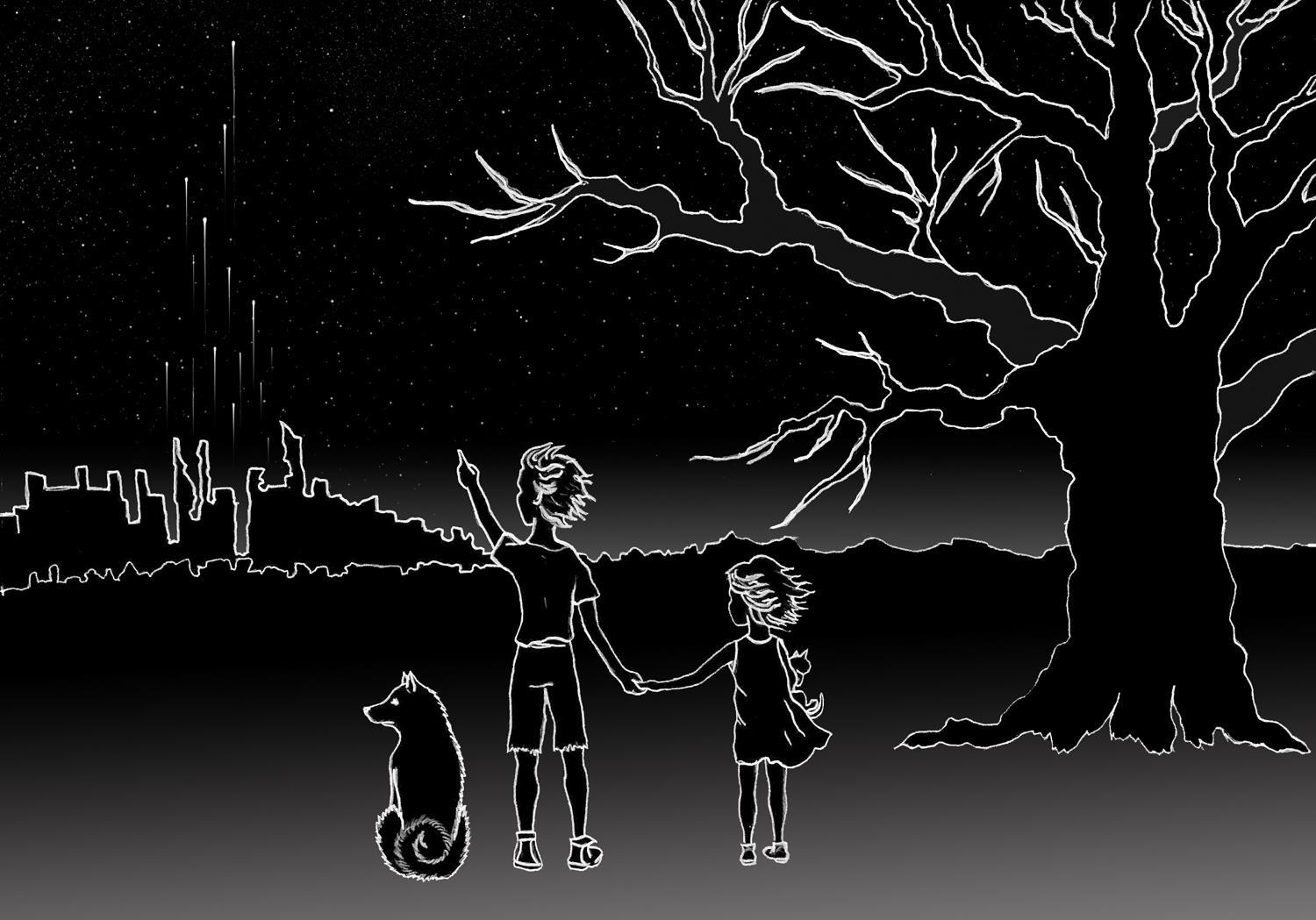 Я остановилась на пейзаже. Нарисовав его, я поняла, что он пуст, и детали со звёздами просто неразличимы. И тут пришли дети, привели собаку, принесли котю и остановились смотреть, как появляются новые звёзды. Да, в рассказе даже намёка нет на этих персонажей, но мне захотелось, в первую очередь для себя, оставить крохотную надежду на спасение. Соглашусь, что подошла к заданию весьма вольно, но уж, что вышло, то вышло, и прошу Kinini на меня не серчать))