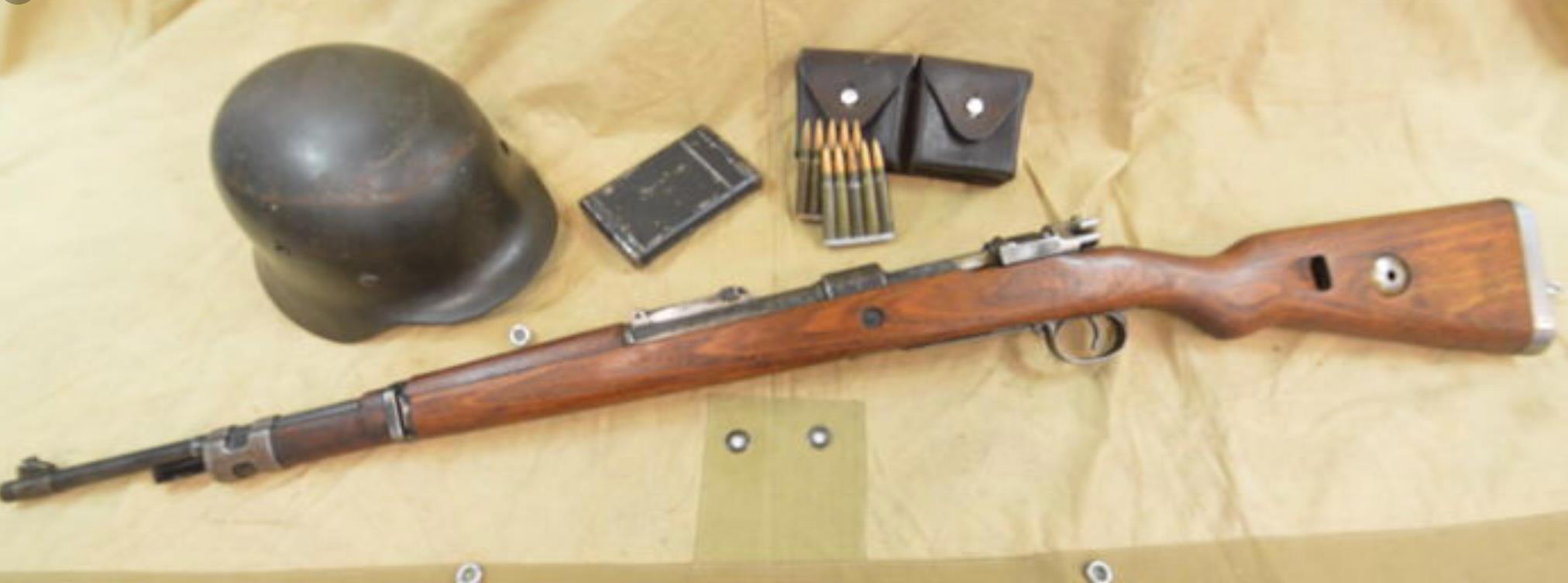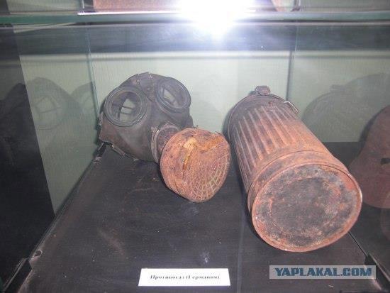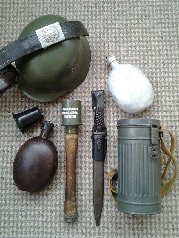 Солдатская амуниция - каска, ремень, фляги (без чехлов и колпака-стакана), штык-нож, противогаз. Граната тут лишняя.