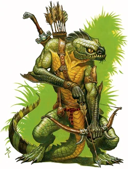 Желтоватый мужской торс, покрытый крупной, с ноготь большого пальца богатыря, чешуёй. Худощавые человекоподобные руки, уже более тёмные, сине-зелёных переливов, оканчивающиеся при этом чёрными коготками. Дублёные кожаные штаны с прорезью для толстого остроконечного хвоста, нервно метавшимся позади него из стороны в сторону. Морда была вытянутой, пучеглазой, чешуя вновь светлела в оформлении контуров рта, словно губы, которые на самом-то деле у существа отсутствовали, если так посмотреть. Где-то у шеи висели складки и припухшая кожа, словно какой-то горловой мешок.