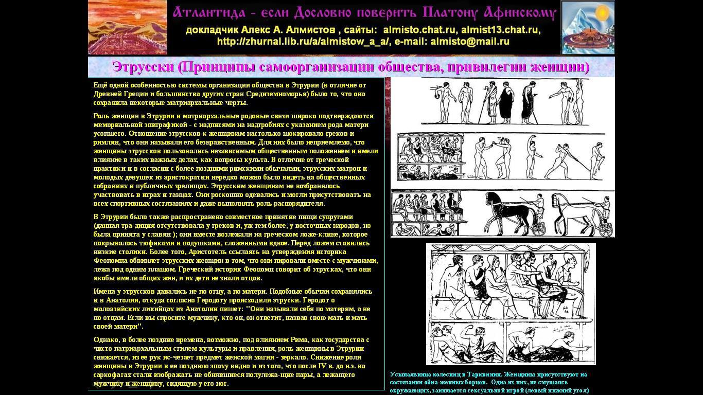 Автор: Алекс А. АлмистовОсобенности взаимоотношения (социального и гражданского) наших возможные предков до Христианства - Принципы самоорганизации общества у этруссков. Особые (для античности) привилегии женщин