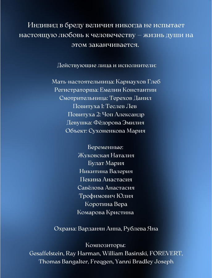 Мне очень понравилась работа девушек - Мостицкой Вероники и Дёмкиной Александры -, не смотря на изменение некоторых деталей и, что главное, концовки произведения. Весь спектакль, с минимумом атрибутики и длящийся всего одиннадцать минут, прекрасно срежиссирован и хорошо показывает нам устройство мира сказки Григория.
