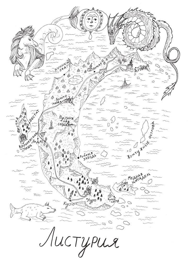 На третьей картинке чистовик карты Листурии. Здесь обозначено намного больше подробностей и названий мест. Некоторые из них важны для истории мира, другие -конкретно для моих книг. Например, Луро - малопримечательная точка. Кроме, пожалуй, того факта, что здесь жил один из главных героев первой книги. Кусто же, уже город более известный потому, что сюда часто прибывают корабли из Медной цитадели, привозя редкие морские трофеи.