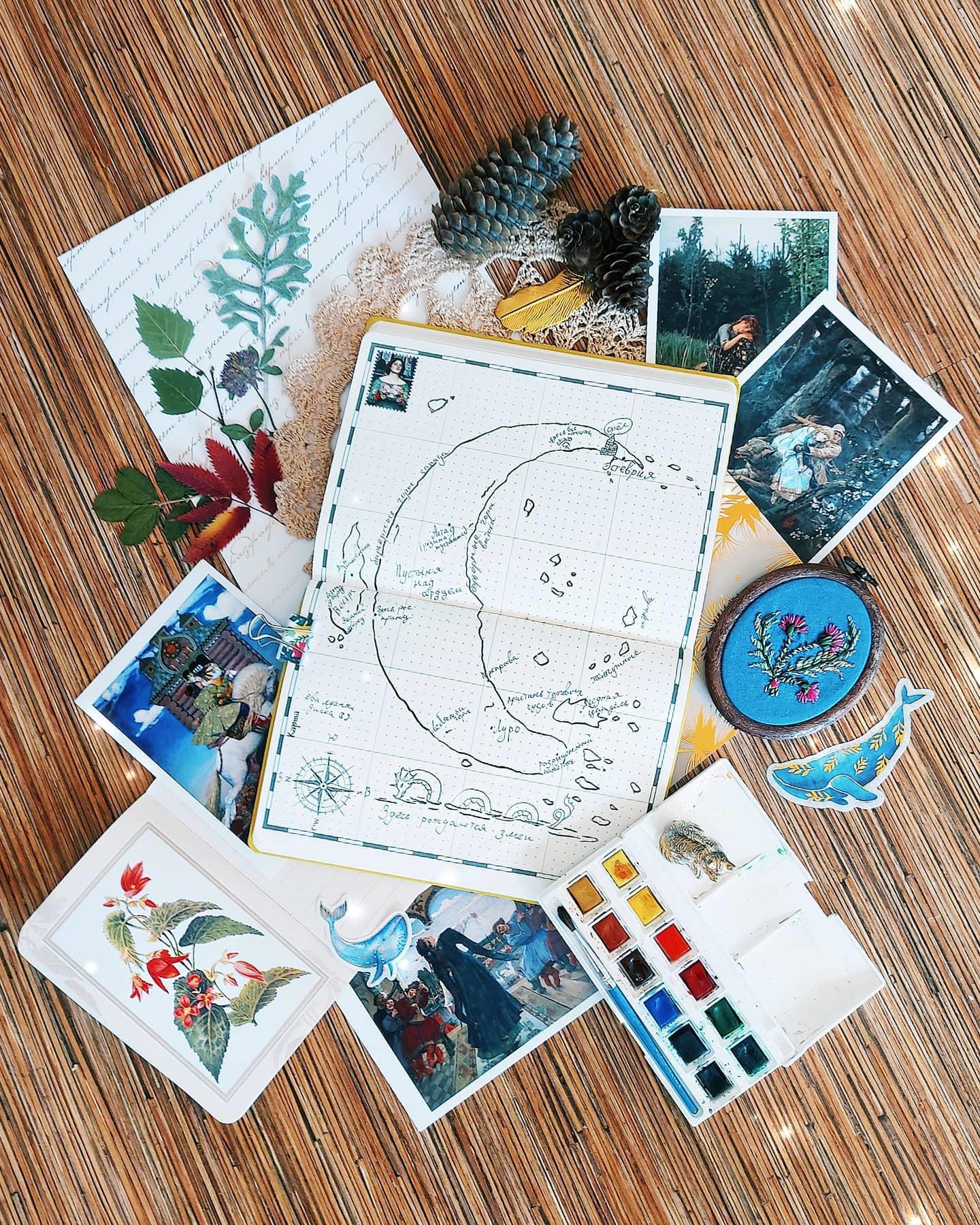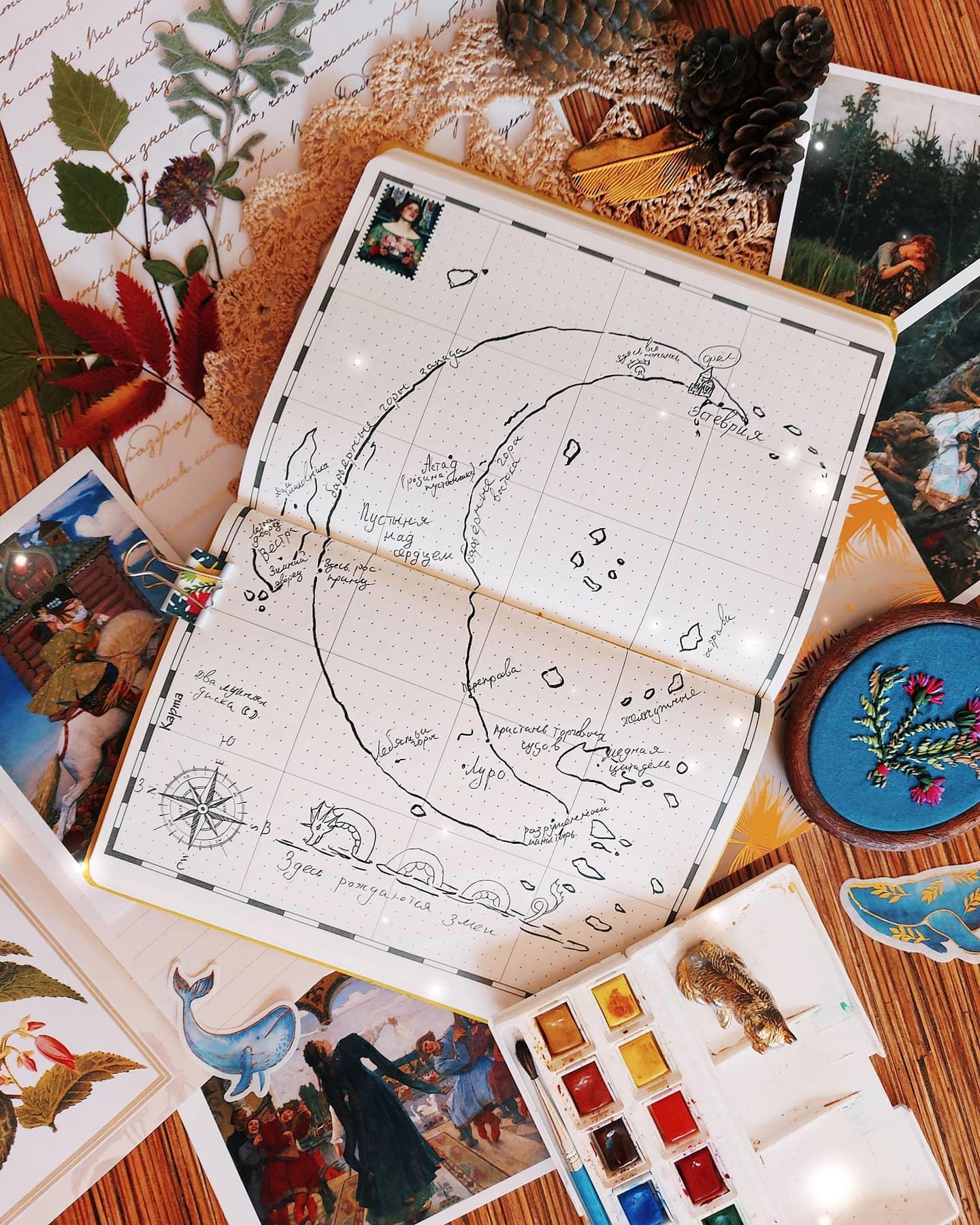 На самом деле на фото черновик карты, который я рисовала для своей вселенной. Карту я придумывала недолго. Дело в том, что за рисунок я взялась уже после того, как написала первую книгу. Да и со времени завершения черновика "Глазами сокола" к моменту создания карты прошло немало времени. Потому-то мне просто нужно было отметить на карте то, что я уже знаю про этом уютный мир. На фото я так же собрала антураж, который, как мне кажется, создаёт определённую атмосферу сказочности. "Глазами сокола" задумывалась, прежде всего, как сказка для взрослых. Как и в мире в целом, так и в книге в частности очень много чудесного, потустороннего, но, в то же время, жители Листурии уже мало чему удивляются. Посплетничать любят - это да, а вот почему у королевича некого города N, вдруг, жабры выросли - так кто же таких историй не слыхал?