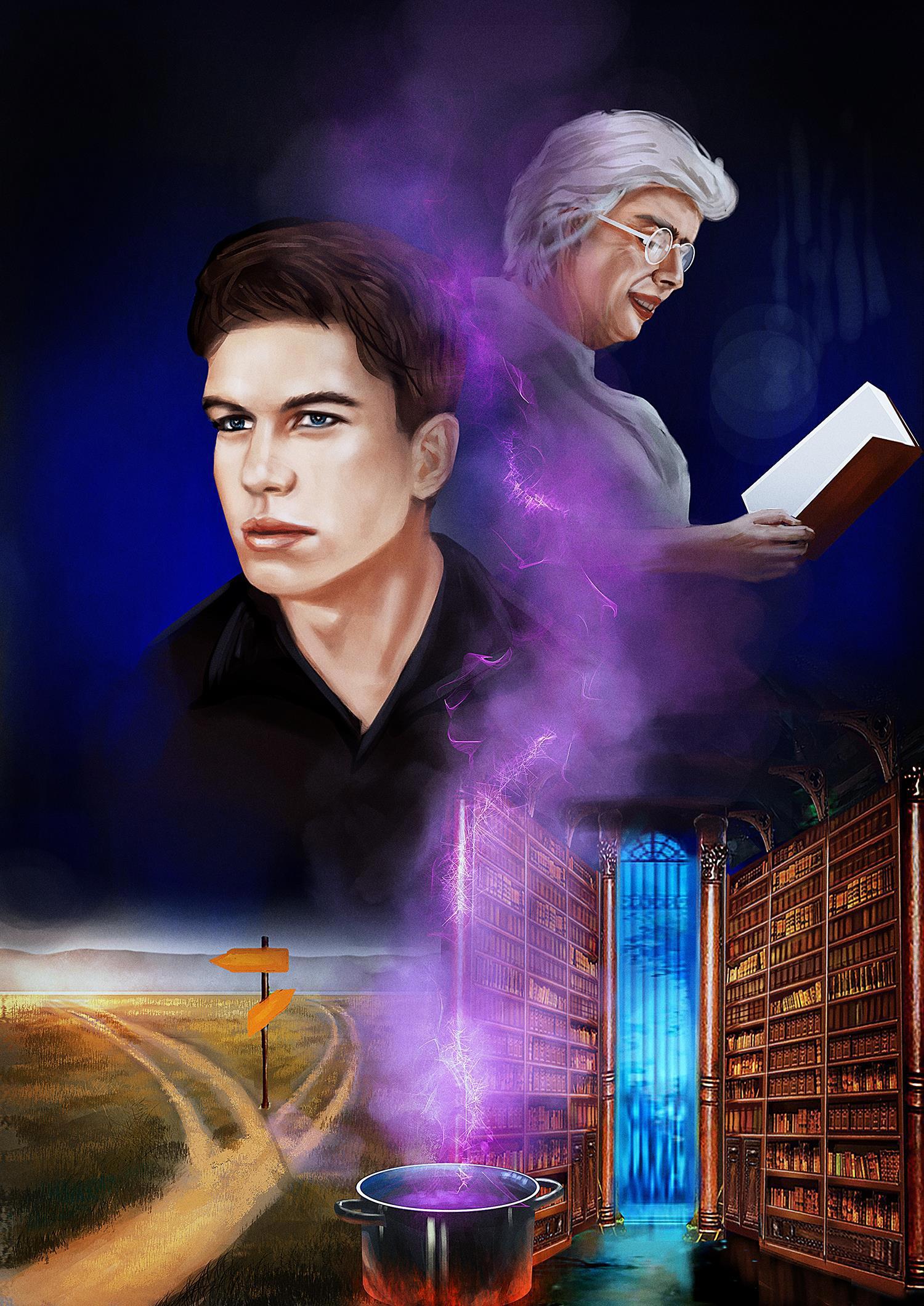 Макс Ростовский на рассказ "Заклинание ветвящейся дороги". Получился прямо кинопостер! Столько много достоверных элементов прямо из рассказа - библиотека, котелок с ярким дымом, сама дорога в нигде, и отличная визуализация персонажей. Иллюстрация лежит здесь: https://author.today/art/64785