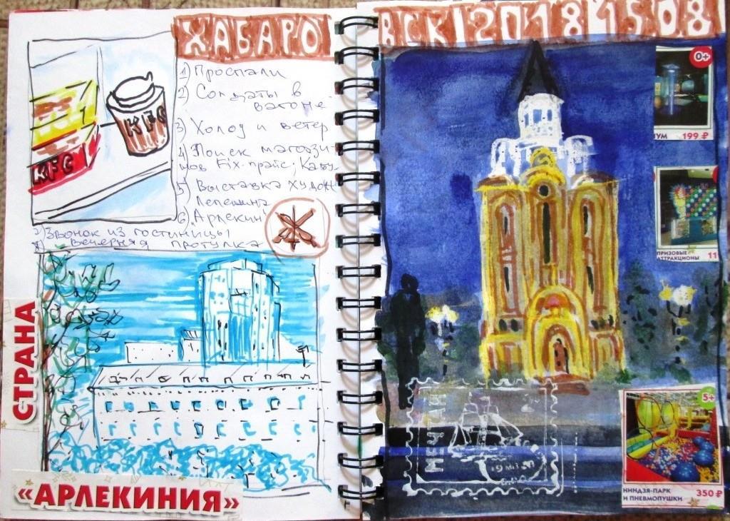 Правда, большая часть моих рисунков была скетчами, так как это не требует много времени. Я набила руку, у меня стал более уверенный рисунок. Впервые попробовала сделать несколько страниц полноценного тревел-бука.
