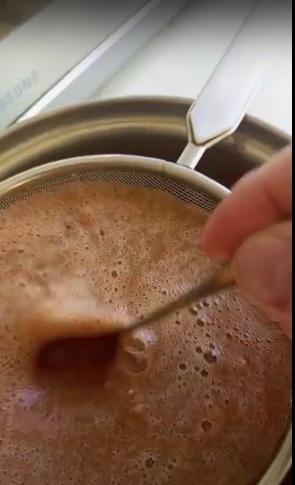 У вас должна получиться бурая густая жидкость с комочками. Переливаете ее через сито в кастрюльку, тщательно перемешиваете жидкость в сите, чтобы она пролилась в кастрюлю. Жмых выкидываете.