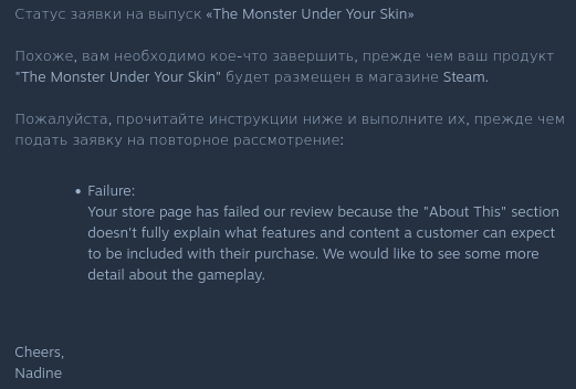 Автор: Roman OПолучил с утра письмо счастья от стима по поводу оформления страницы с моей игрой: