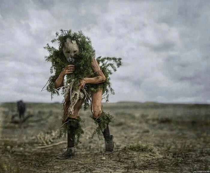 1904 год, США. Индеец навахо, одетый как То Нейнили, бог дождя народа навахо. Это божество развлечений и трюков.