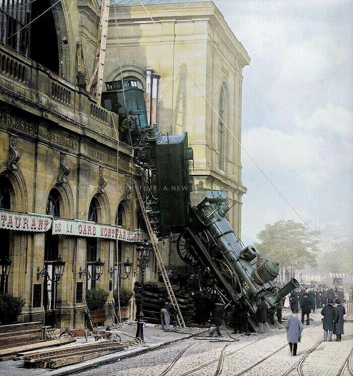 Автор: Homo Vulgaris22 октября 1895 года, Франция, Париж. Крушение поезда на вокзале Монпарнас. Поезд проехал через буферную остановку и разбил окно из-за того, что водитель приближался к станции на слишком высокой скорости. Удивительно, но в результате этой катастрофы погиб всего 1 человек - случайная прохожая, на которую упали камни разрушенного ограждения.