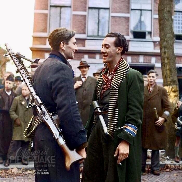 29 октября 1944 года, Нидерланды. Голландские борцы Сопротивления во время празднования освобождения города Бреда 1-й польской бронетанковой дивизией.