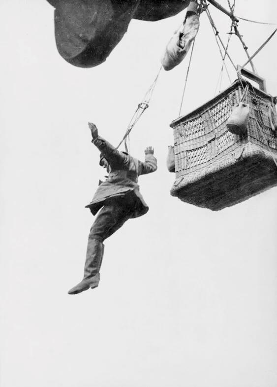 1918 год. Немецкий наблюдатель прыгает с парашютом с воздушного шара.