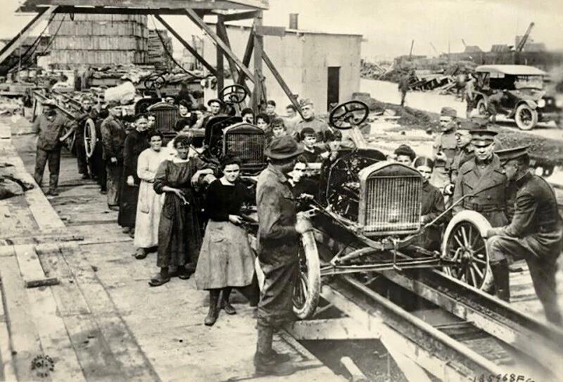 1910-е годы, США. Женщины, работают на сборочной линии Ford под открытым небом.