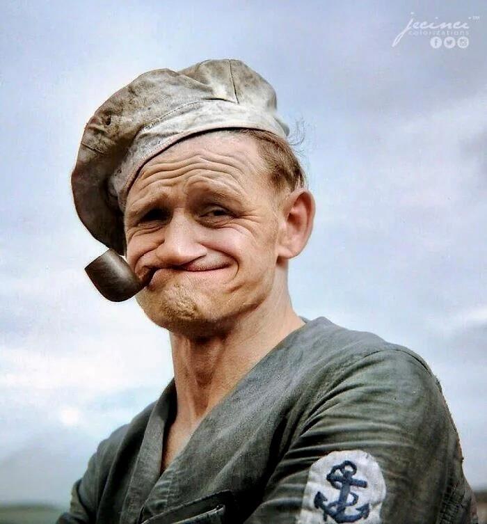 Сентябрь 1940 года. Кочегар Королевского флота с 21-летним стажем по прозвищу «Попай», сфотографирован на борту линкора HMS Rodney.