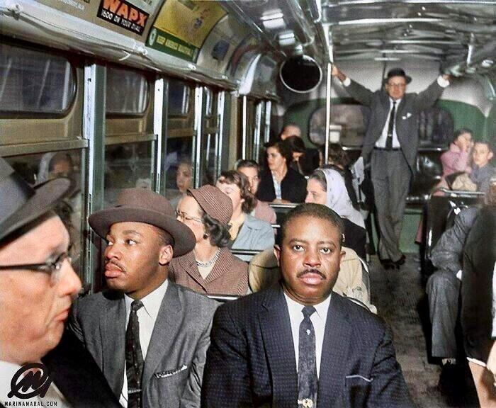 Декабрь 1956 года, США, Алабама, Монтгомери. Мартин Лютер Кинг-младший и Ральф Абернати едут в первом автобусе без расовой сегрегации.