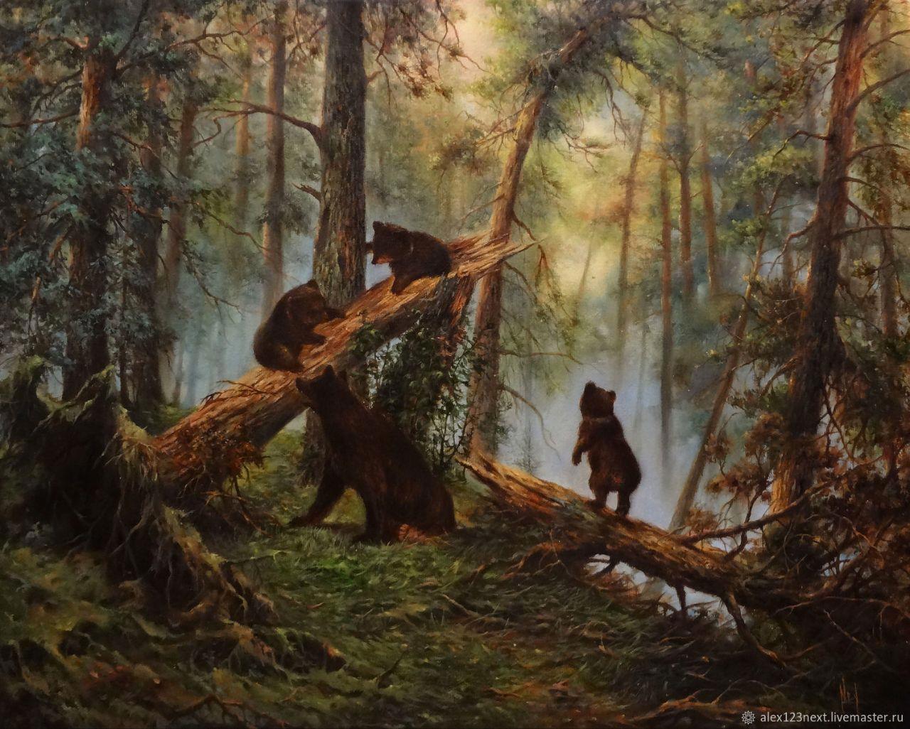 История создания знаменитой картины окутана тайной. Существует легенда, что, придя в гости к Константину Савицкому, Шишкин увидел на мольберте полотно с очаровательными медвежатами, нарисованными Савицким для своего ребёнка. Медведи так понравились Ивану Ивановичу, что он упросил друга отдать холст ему. Эта версия подкрепляется письмом самого Савицкого к родным: «…Затеял я как-то картину с медведями в лесу, приохотился к ней. И Иван Шишкин взял на себя исполнение пейзажа…» Другая версия гласит, что толчком к работе послужил пейзаж «Туман в сосновом лесу», написанный Шишкиным после поездки в вологодские леса. Задний «Утра…» с участком густого леса чрезвычайно похож на дальний вид «Тумана…». Может быть, действительно именно эта работа, вызвавшая восторг у зрителей, породила желание двух художников написать похожий по мотиву пейзаж, оживлённый анималистической сценкой. И Савицкий по эскизу Шишкина пишет медведей, а сам он дописывает окружение.