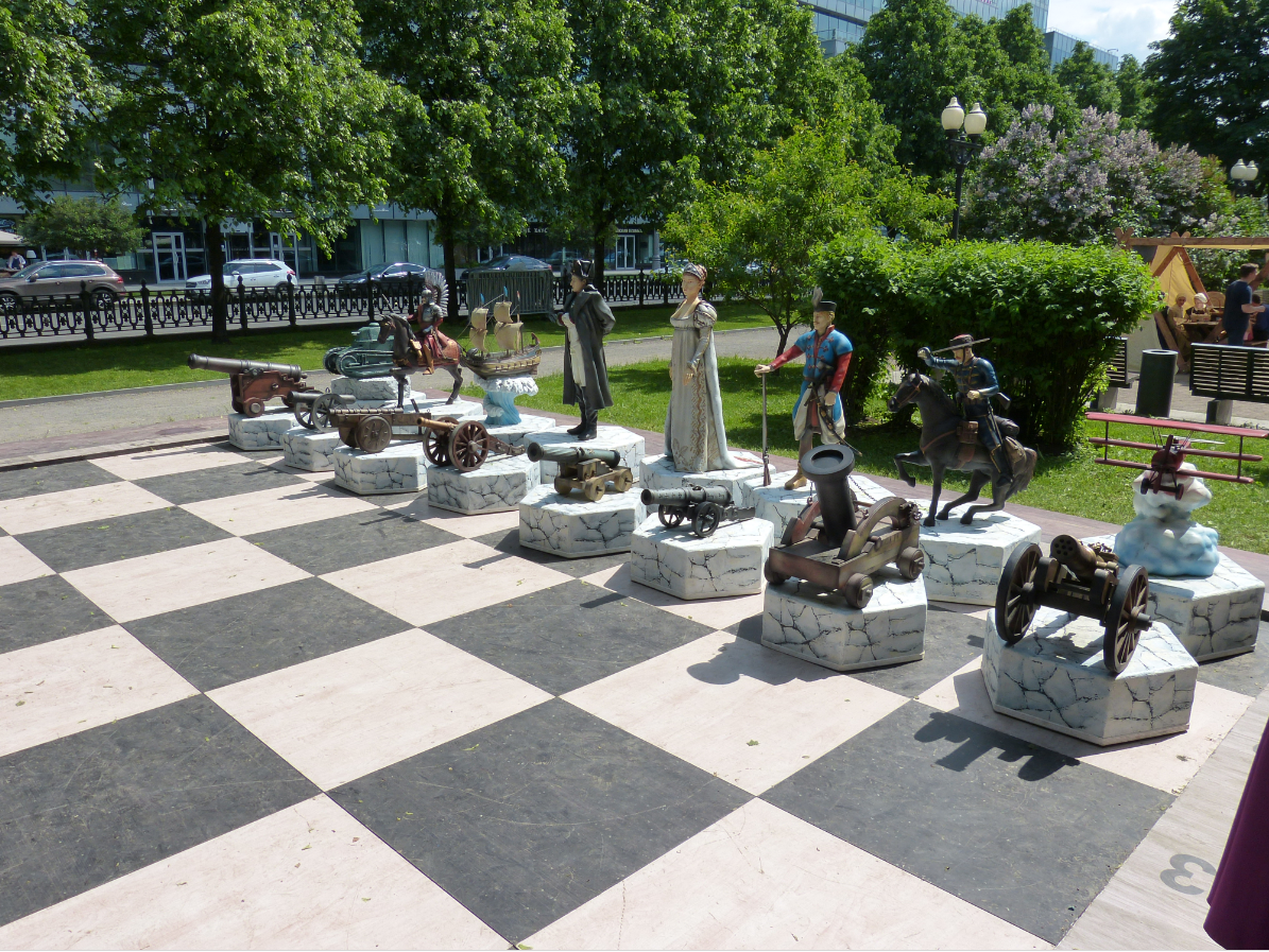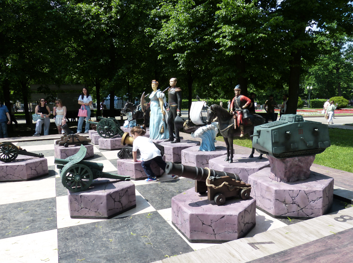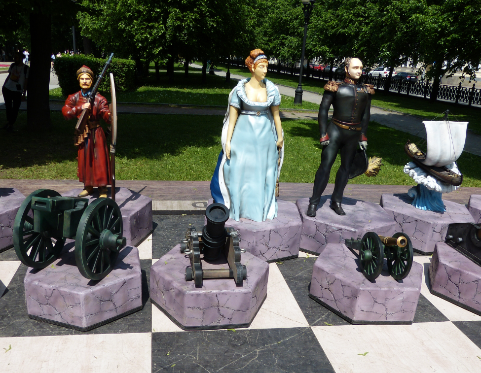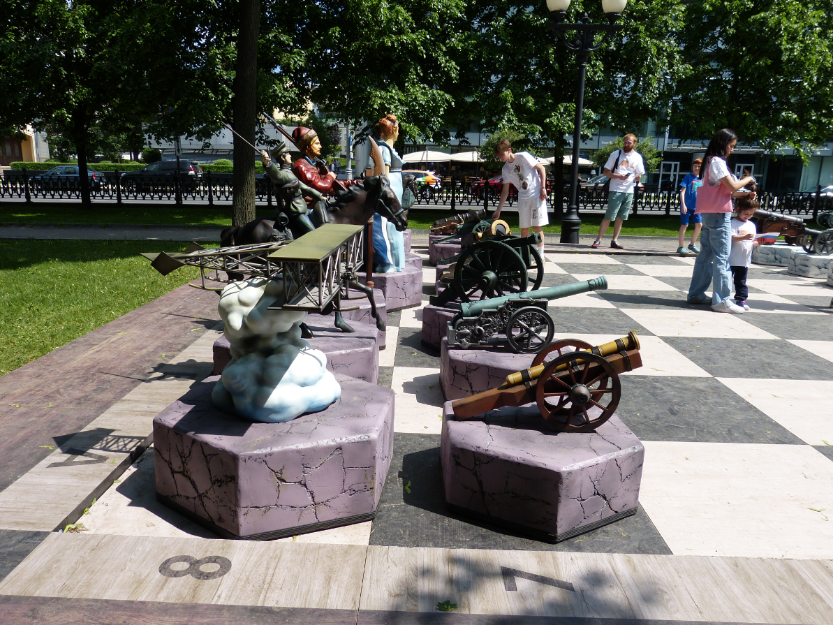 Обратите внимание на чёрного короля и его королеву. Вы ведь их узнали? А ещё я никогда не видел, чтобы роль пешек исполняла артиллерия!