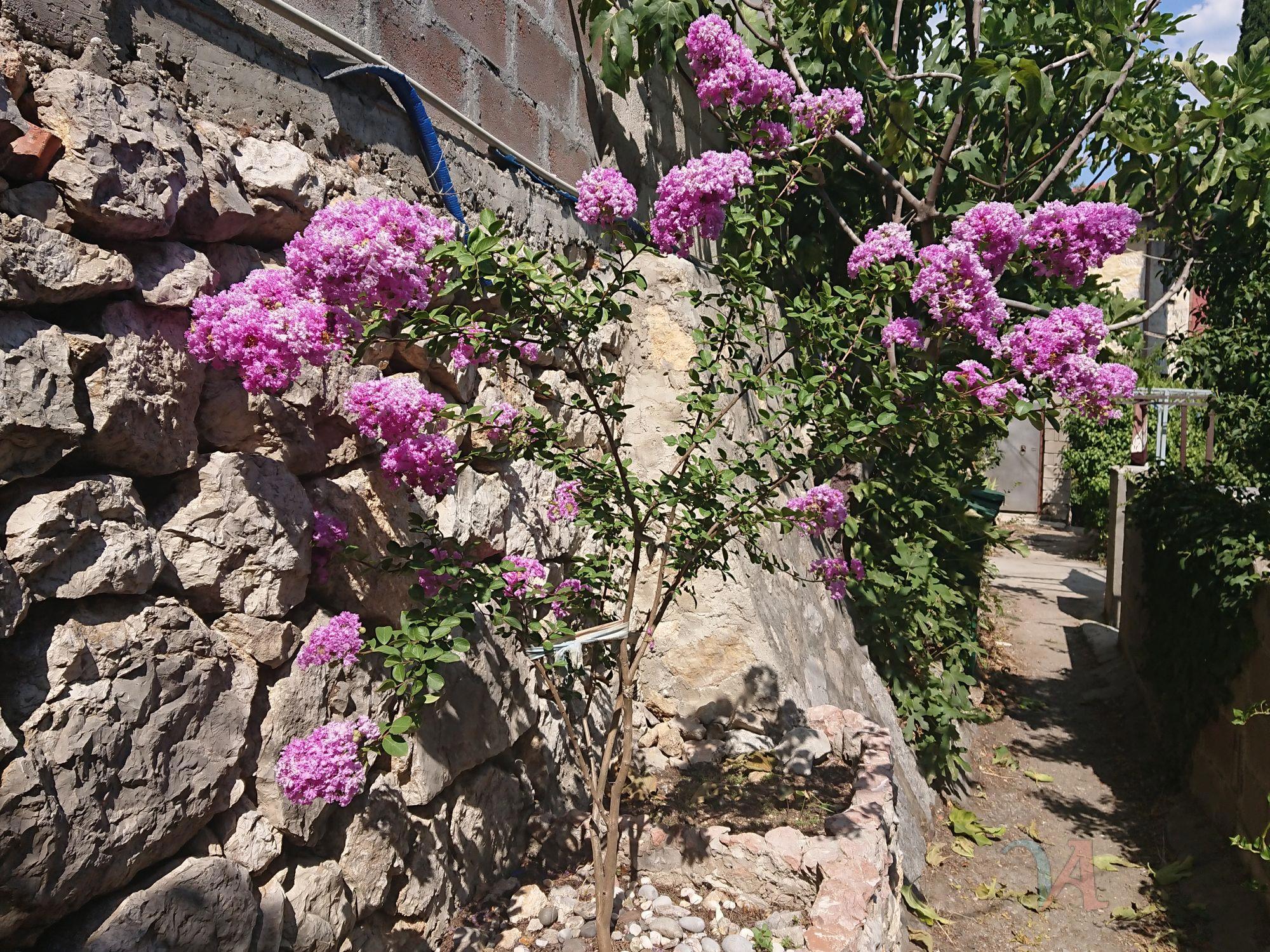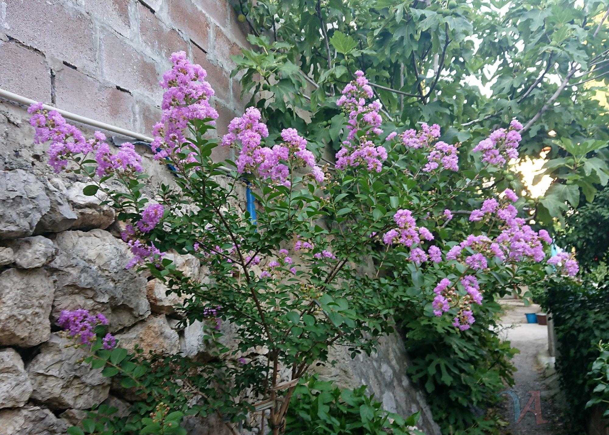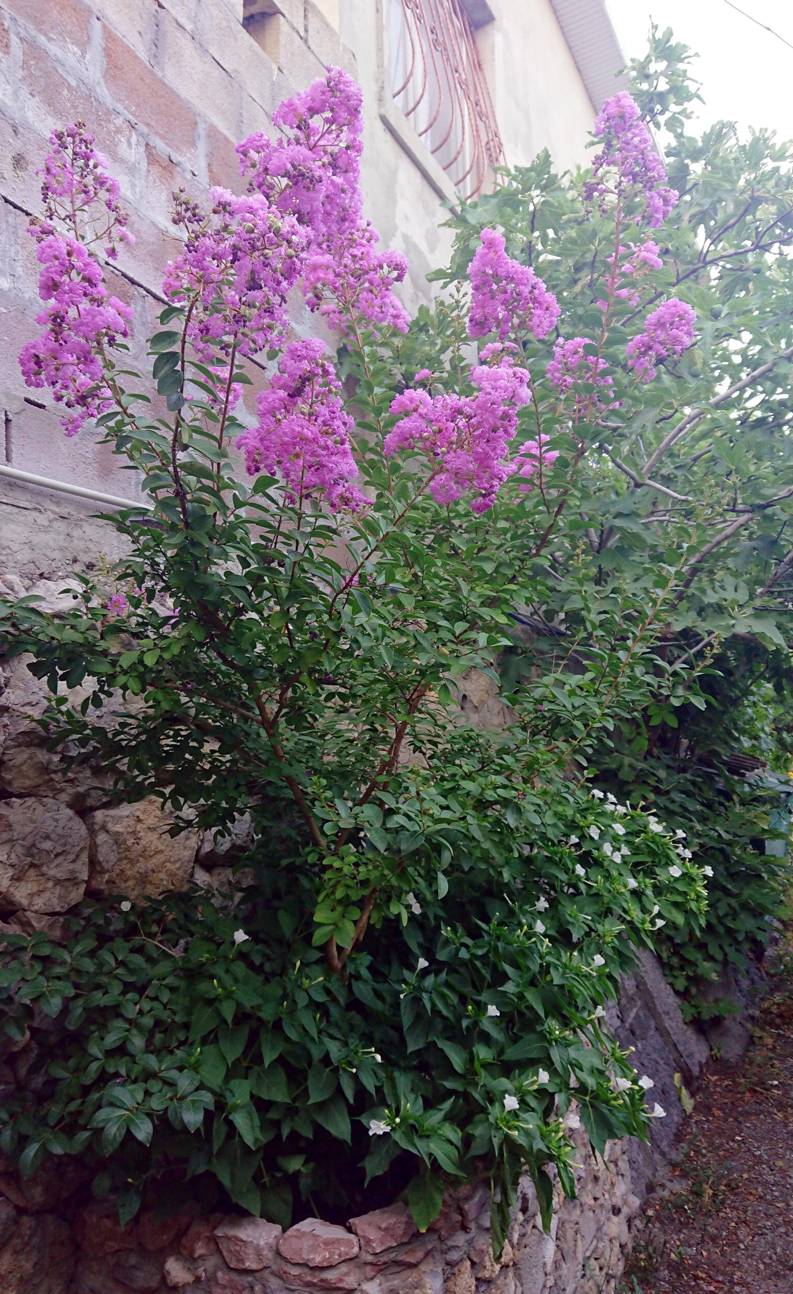 Также соседи сверху начали бить тревогу, что инжир, когда вырастет, разломает подпорную стену. Поэтому было принято решение вынуть землю из клумб, на дно обеих насыпать слой щебня, и клумбу с лагерстремией засыпать покупной нормальной землёй, а то наша кисловатая. К сожалению, инжир пересадки не пережил, хотя выпустил листья в мешке, пока ждал перевалки, но потом их сожрали белые мошки с соседского, и росток засох. А лагерстремия цветёт и радует.