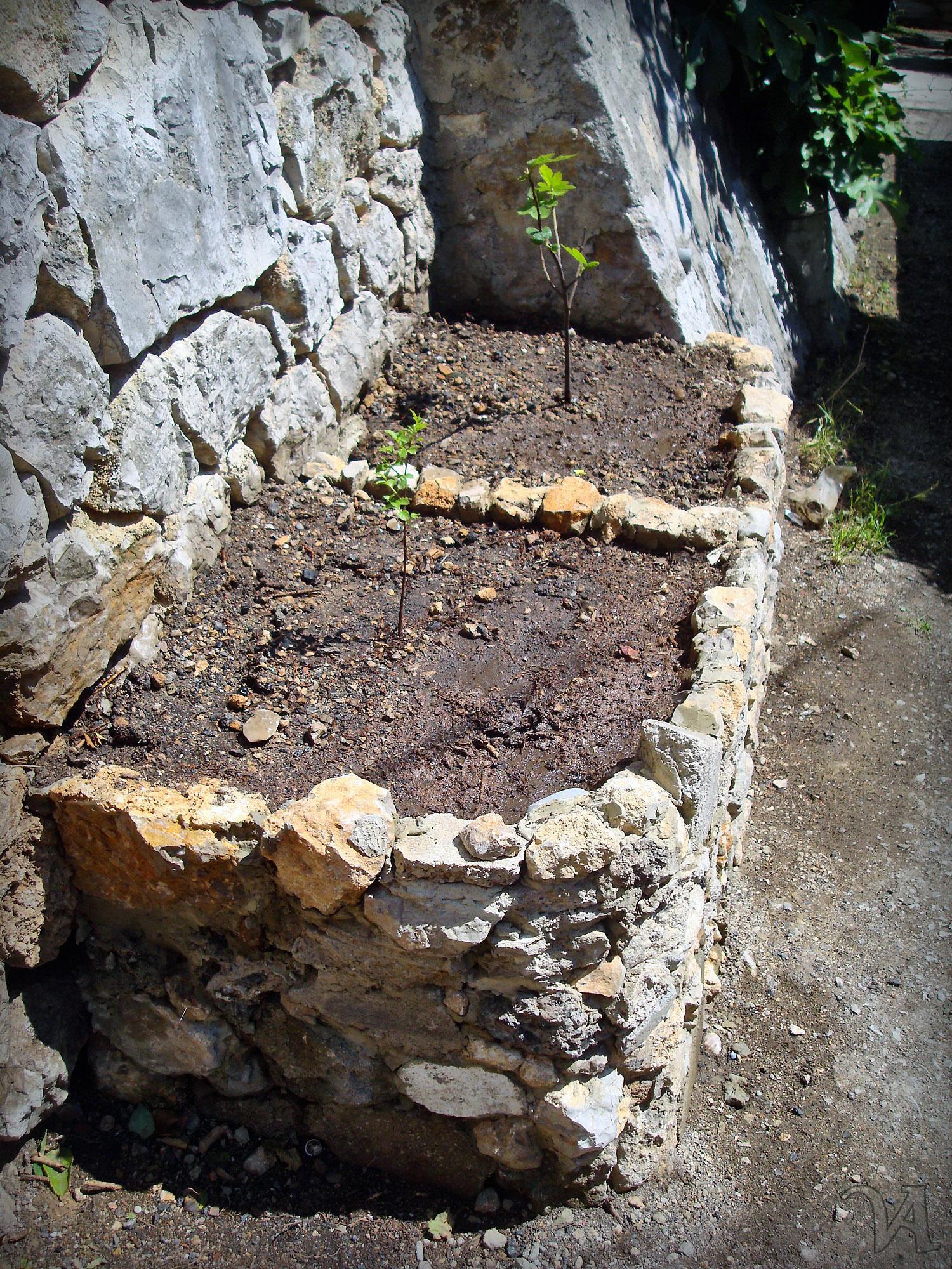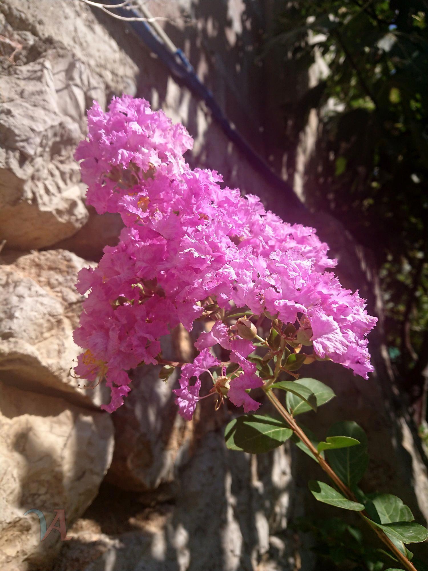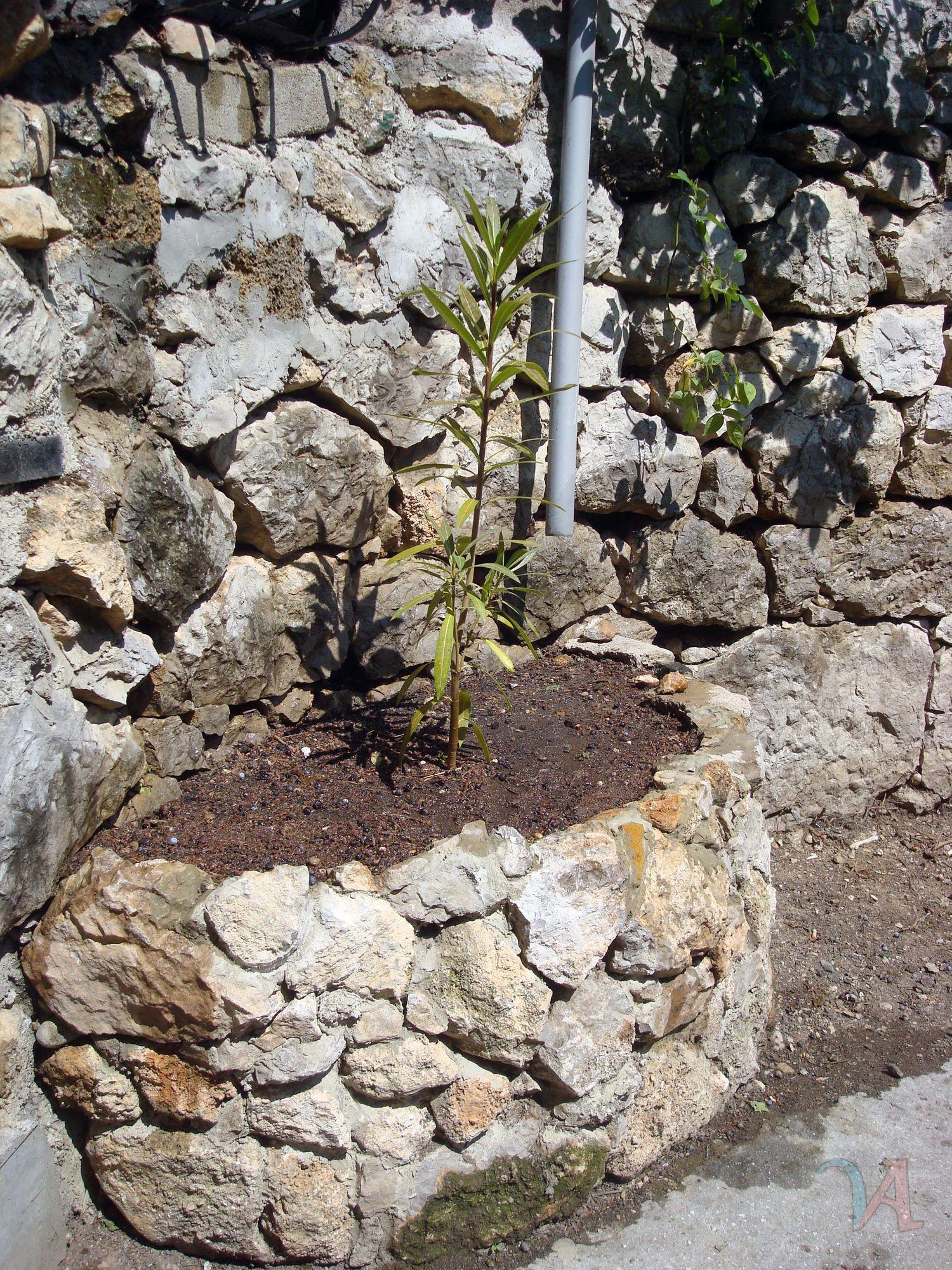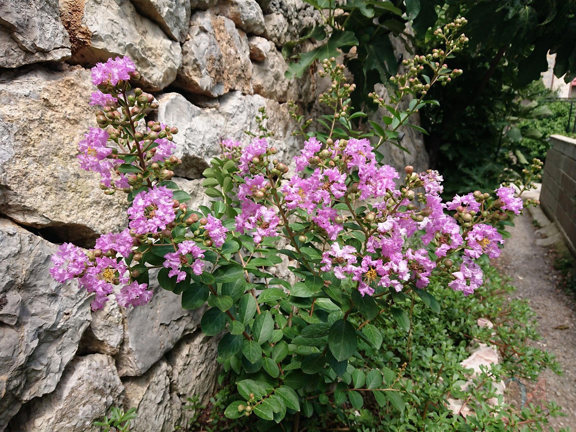 Также соседи сверху начали бить тревогу, что инжир, когда вырастет, разломает подпорную стену. Поэтому было принято решение вынуть землю из клумб, на дно обеих насыпать слой щебня, и клумбу с лагерстремией засыпать покупной нормальной землёй, а то наша кисловатая. К сожалению, инжир пересадки не пережил, хотя выпустил листья в мешке, пока ждал перевалки, но потом их сожрали белые мошки с соседского, и росток засох. А лагерстремия цветёт и радует.