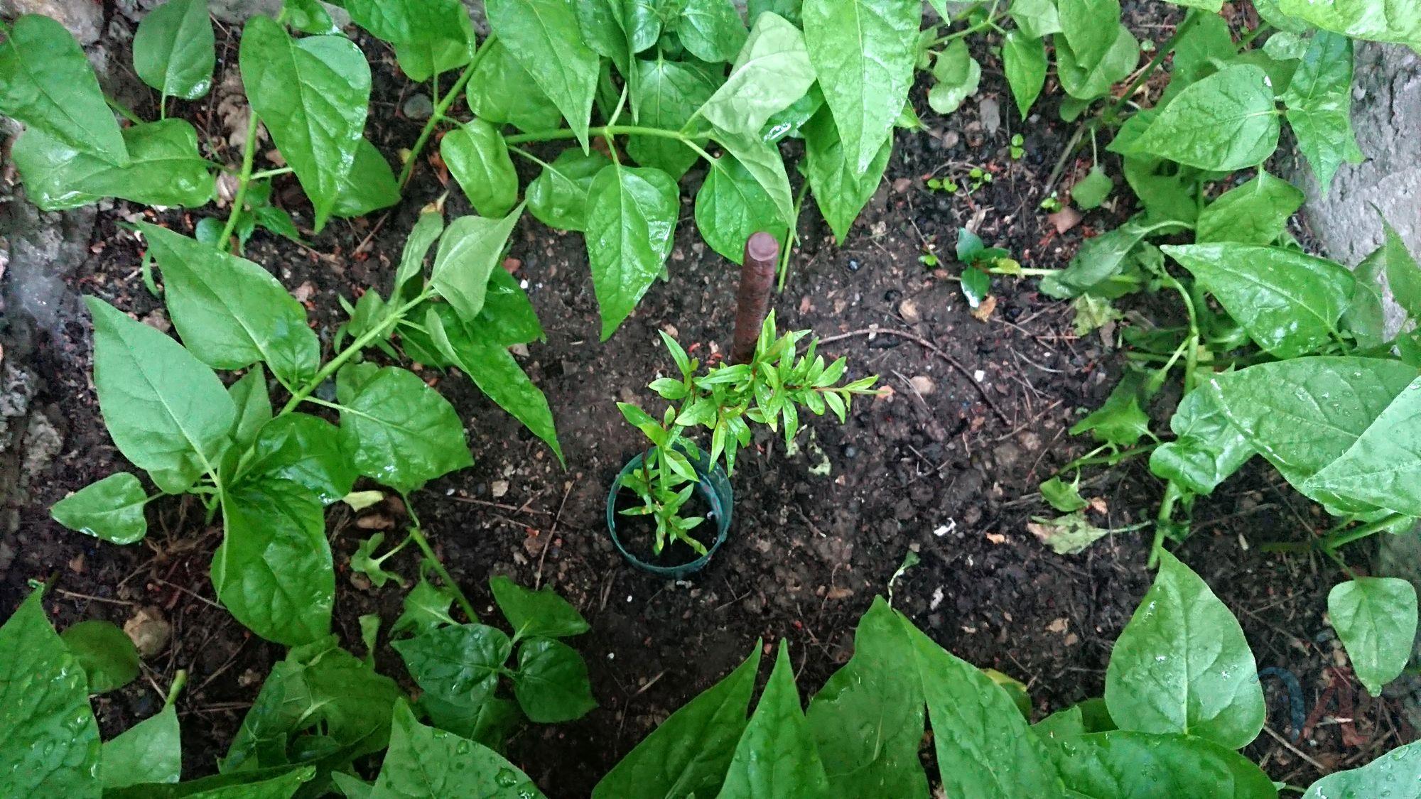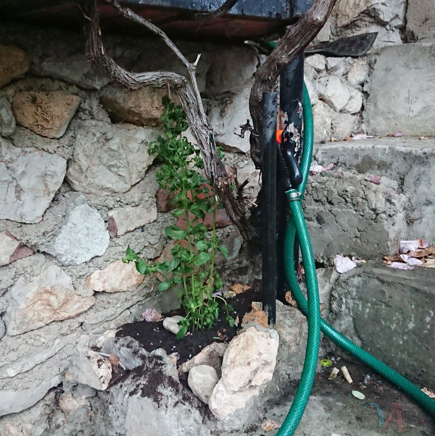 Вообще же после замены ящика и земли я мечтала туда посеять перечную мяту, но мне постоянно не везло. Во-первых, семена я нашла всего раз. Пыталась отращивать корешки, но в земле эта радость погибала (может, тоже коты вылёживали). Женщину, которая продаёт перечную мяту на рынке, никак не могла уговорить, чтобы с корнем привезти. И вот наконец-то в этом году, вместе с остальными саженцами, я на рынке в Ялте купила конкретный такой корневище! Увидев его я поняла, почему мята даже не хотела начинать расти в том ящике. Корень и в навесное кашпо с трудом вмещался! На улице стрёмно - коты, отдыхающие... И я рискнула подсадить её в маленький треугольник к винограду, который был как раз по размеру корня. Досыпала земли. Один минус - полив только ручной, дождь не достанет. Трясусь теперь над ней, хожу каждый день щупаю, чтобы прижилась, ведь столько обломов было!