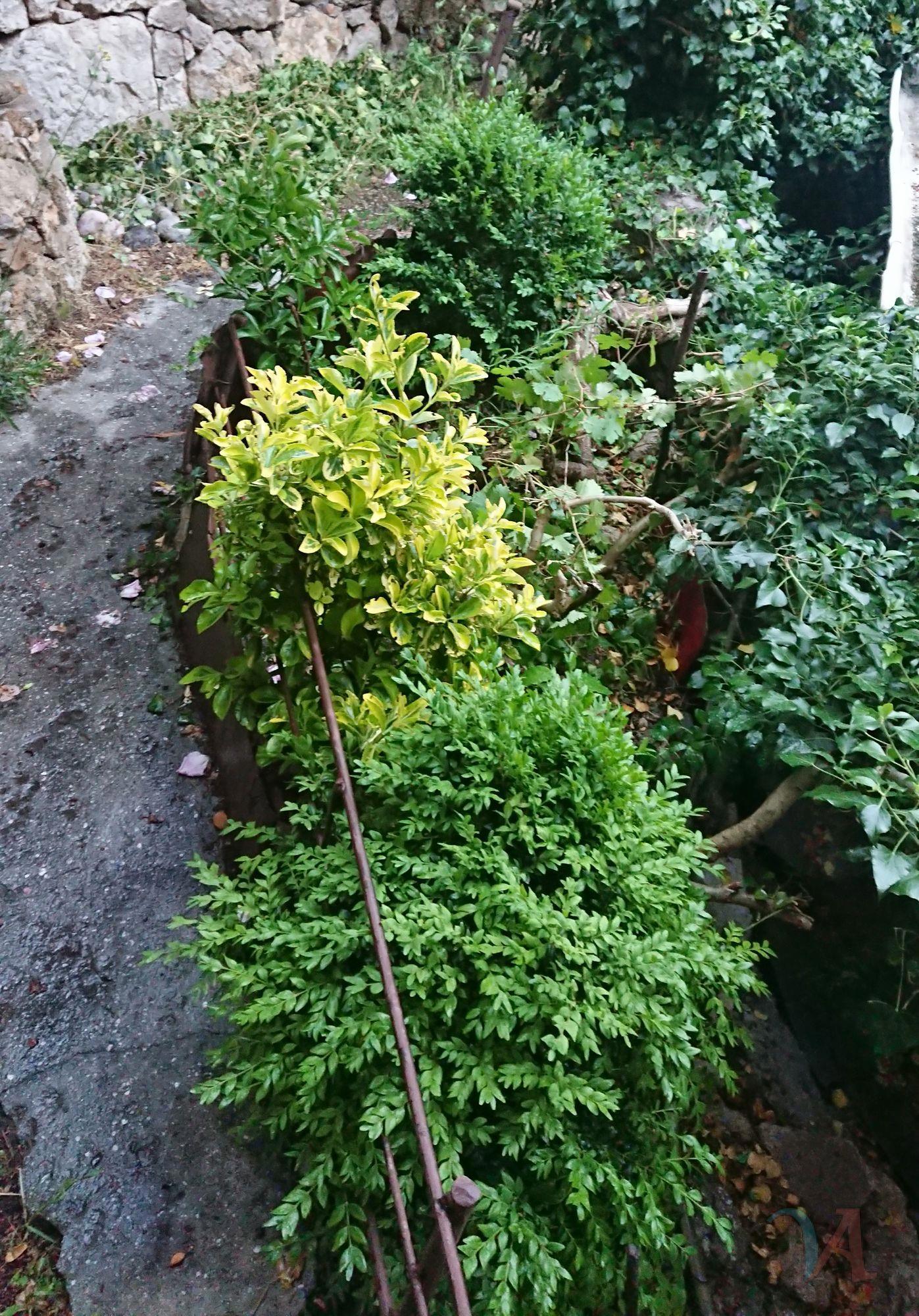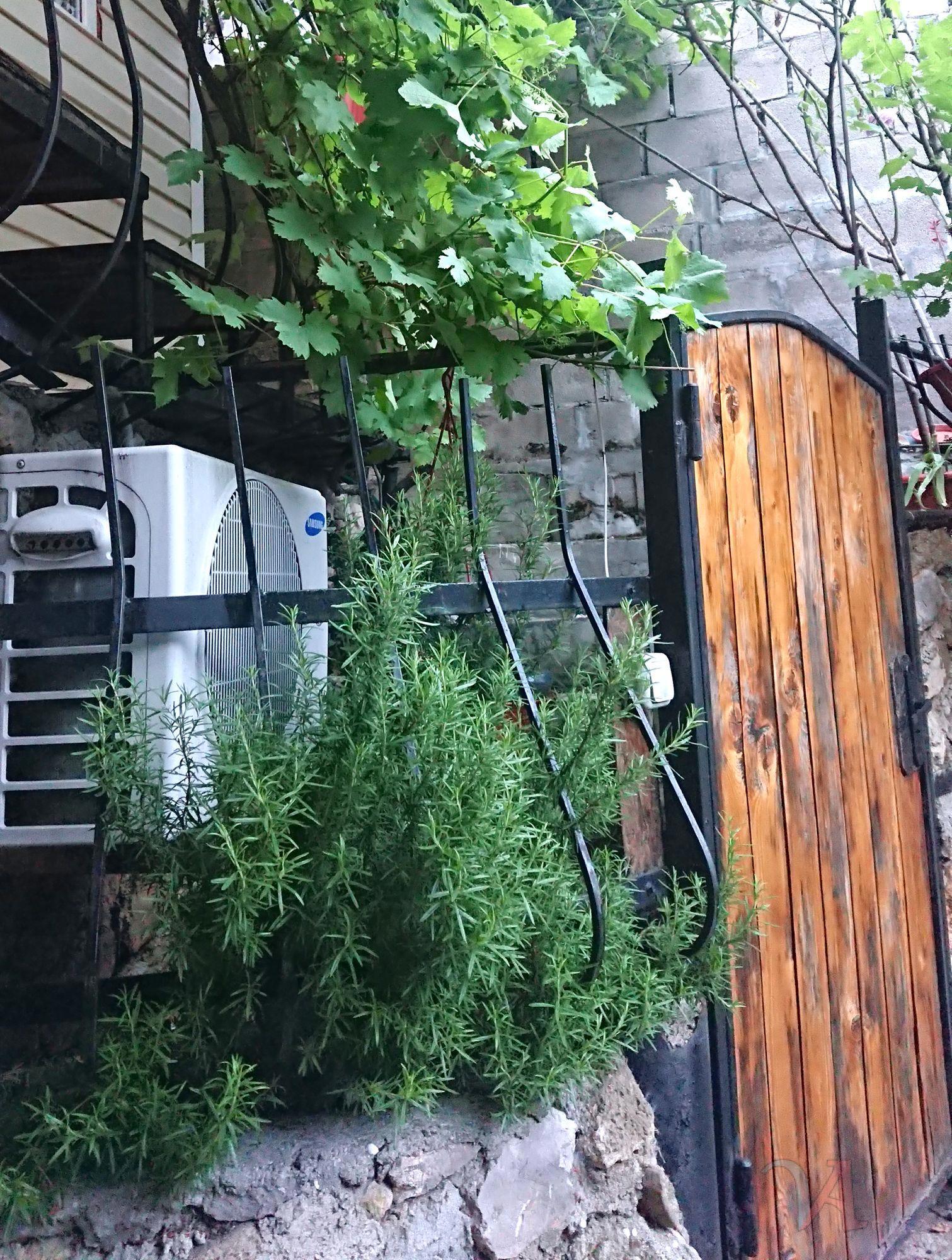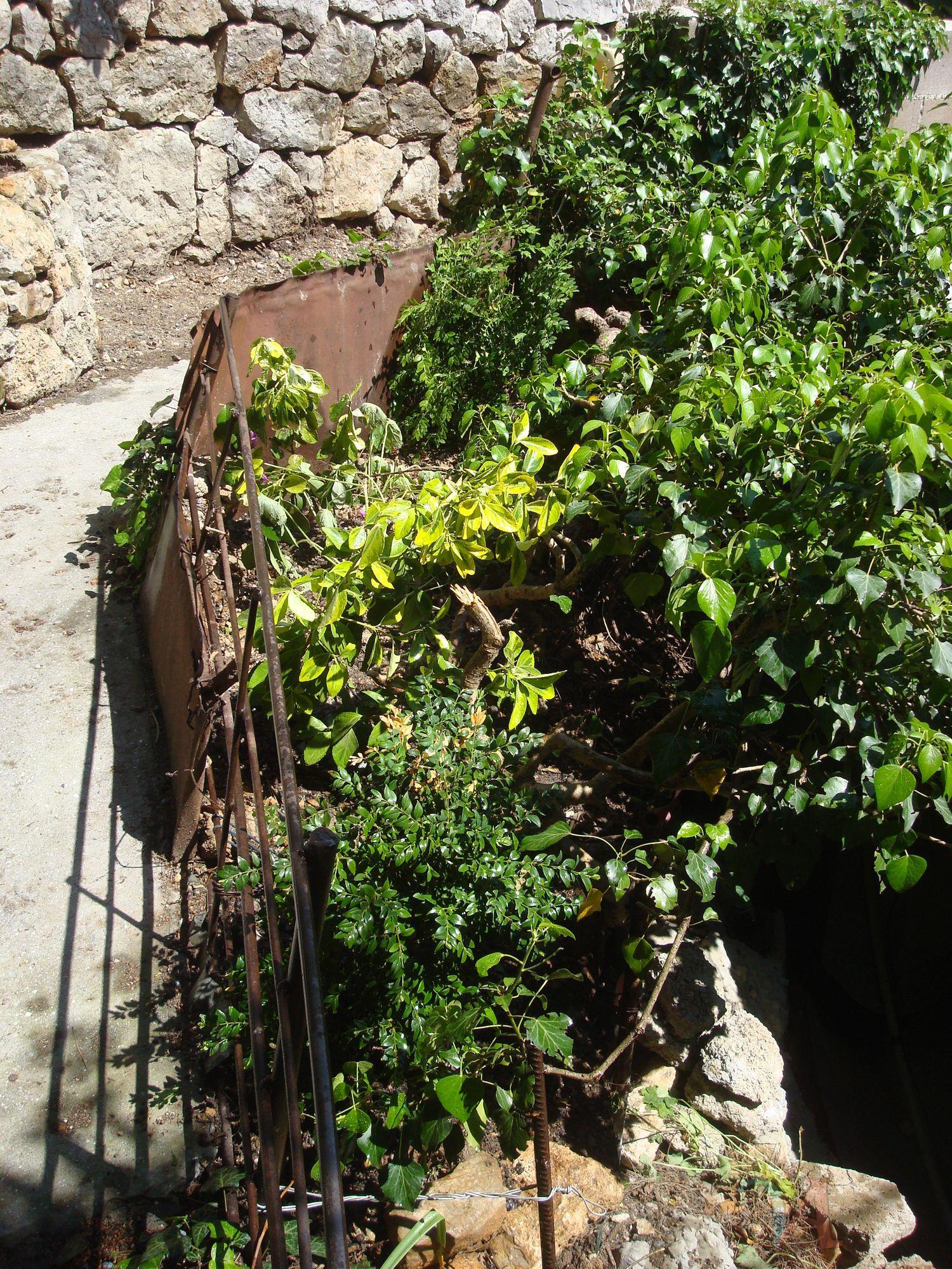 При нём имелась алыча (дерево слева), 4 кустика: два самшита и два бересклета (слева от калитки за решёткой под кондиционером), виноградная лоза внутри поворота лестницы на 2й этаж (справа выше), шток-роза снаружи поворота лестницы на 2й этаж (справа ниже у стены), россыпь ирисов (острые листья ниже и выше), а также кактусы и сирень в куче камней, сваленной у стены слева.