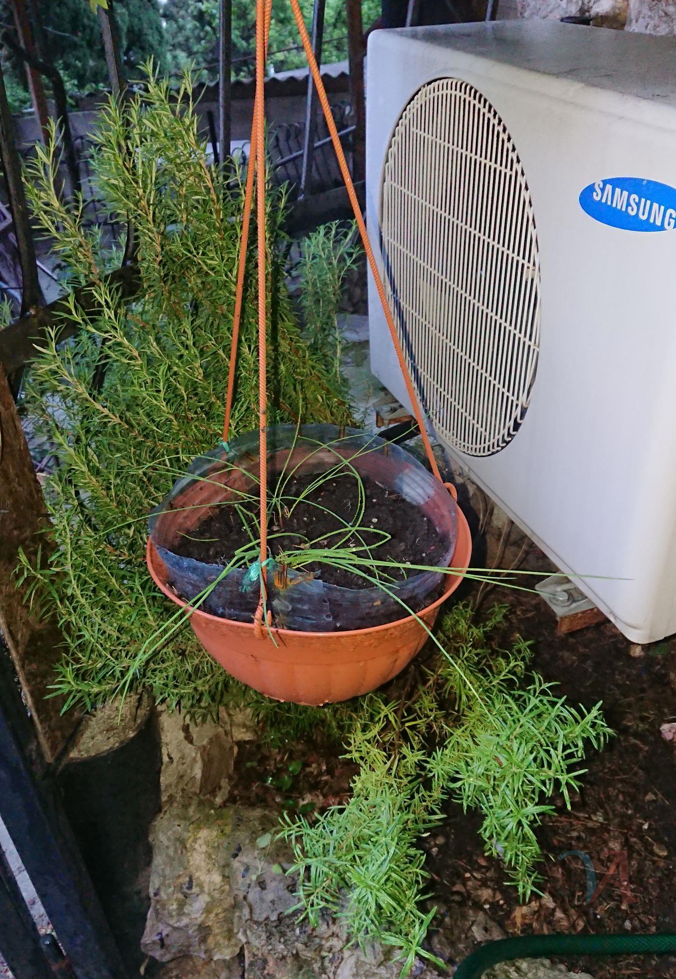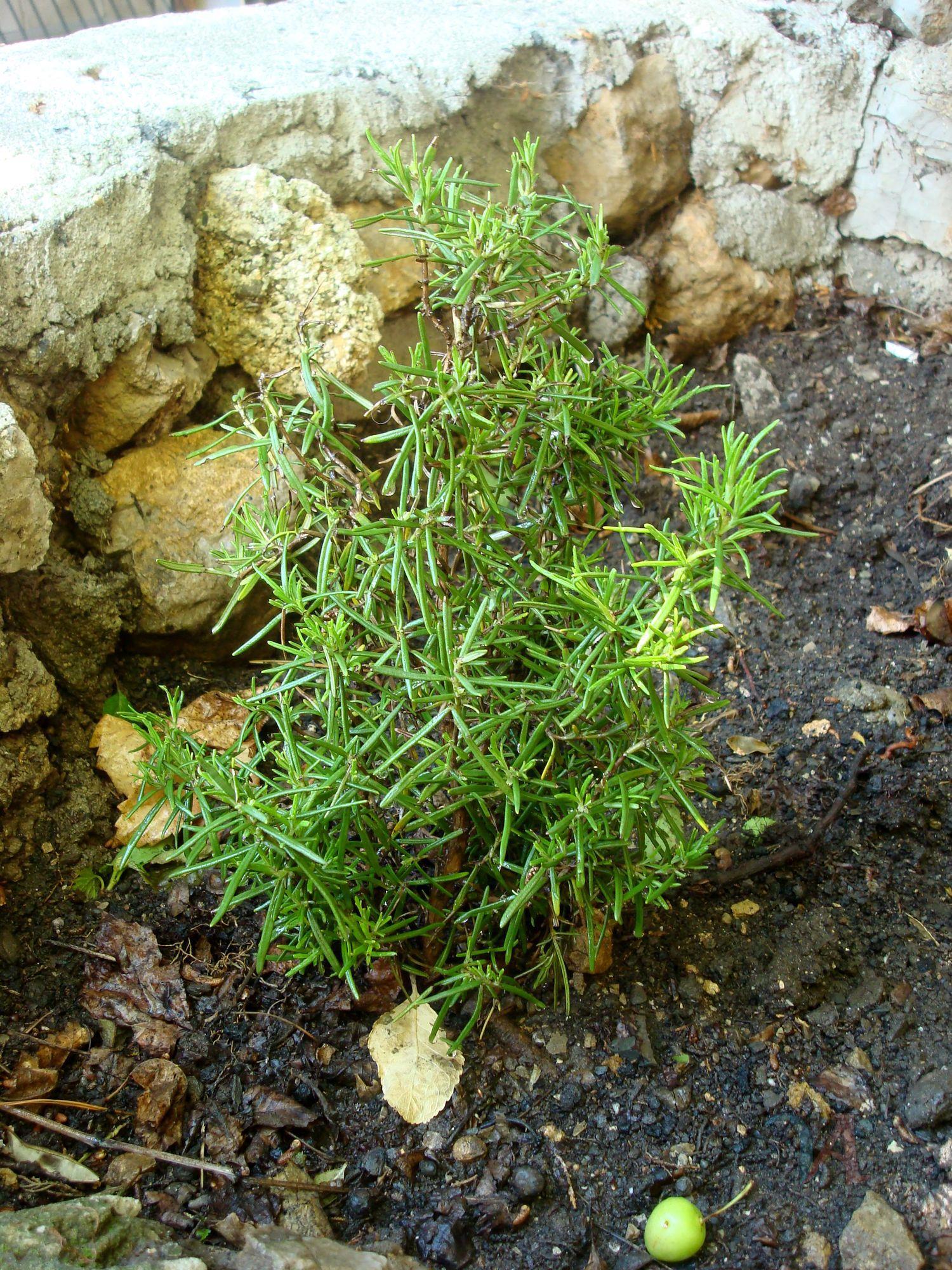 Теперь обратимся к треугольнику под кондиционером. Имевшиеся кустики, теснившиеся там, были пересажены (куда - см. ниже), а туда спёрт из закрытого санатория захиревавший там без полива розмарин. Рядом я периодически сажала лучок, но полноценный цикл развития в почве с камушками у него не получается.