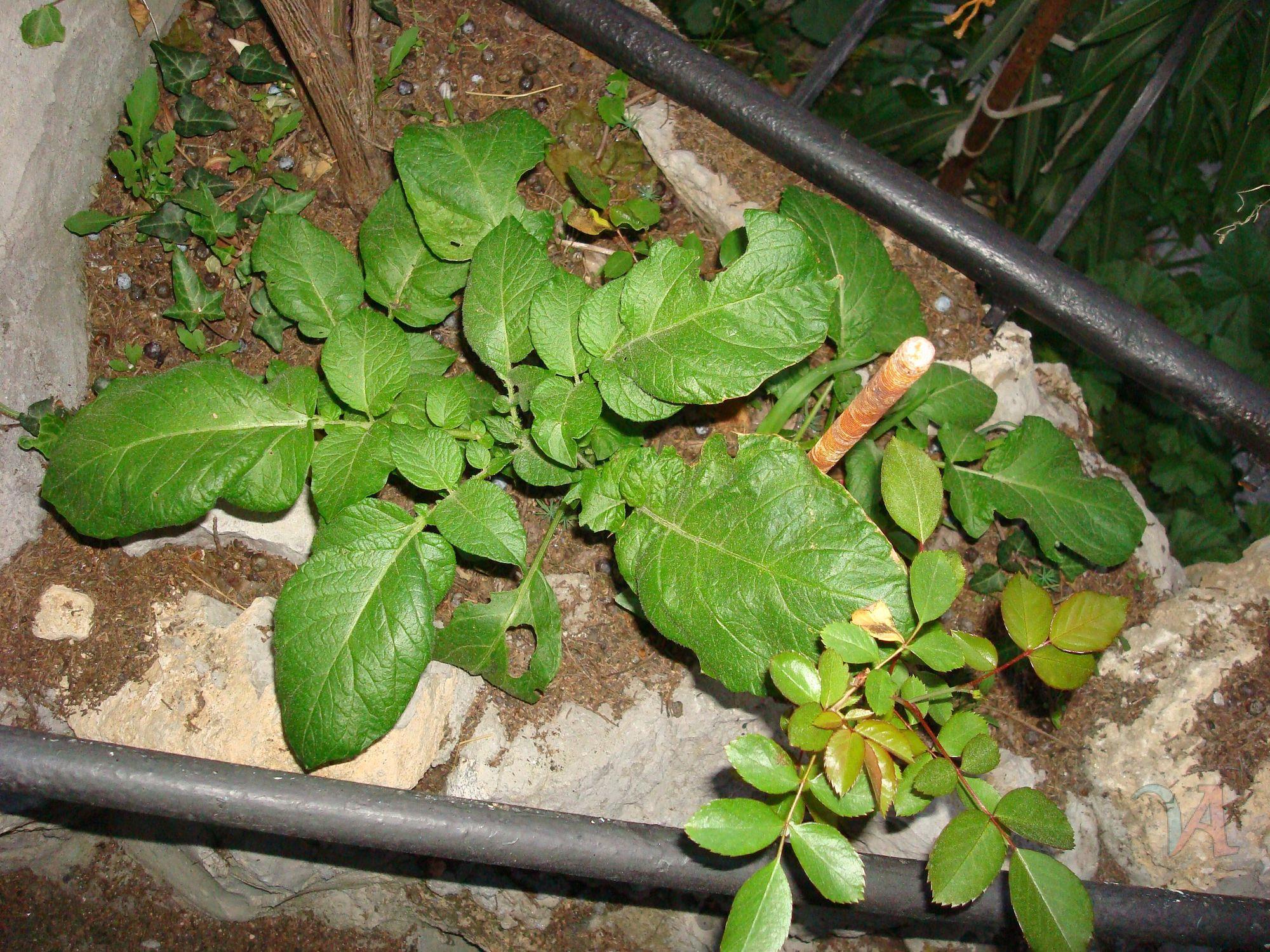 Клочок возле шток-роз был зачищен от ирисов и я туда посадила обычную розочку. Мне обещали, что роза (впрочем, как и олеандр) будет ярко-розовая (фиолетовые я не понимаю), но надули. Однако, она прожила всего три года. Также я пыталась вырастить там красивые розовые розы с городской клумбы, но увы, лишь удивилась, обнаружив на следующий год весной картофель (недоумевала, как он мог туда попасть, и только через месяц вспомнила, что так высаживала черенки). Чуть не вырос имбирь в прошлом году, но всё-таки сдох. То ли личинки жуков поедают, то ли что.