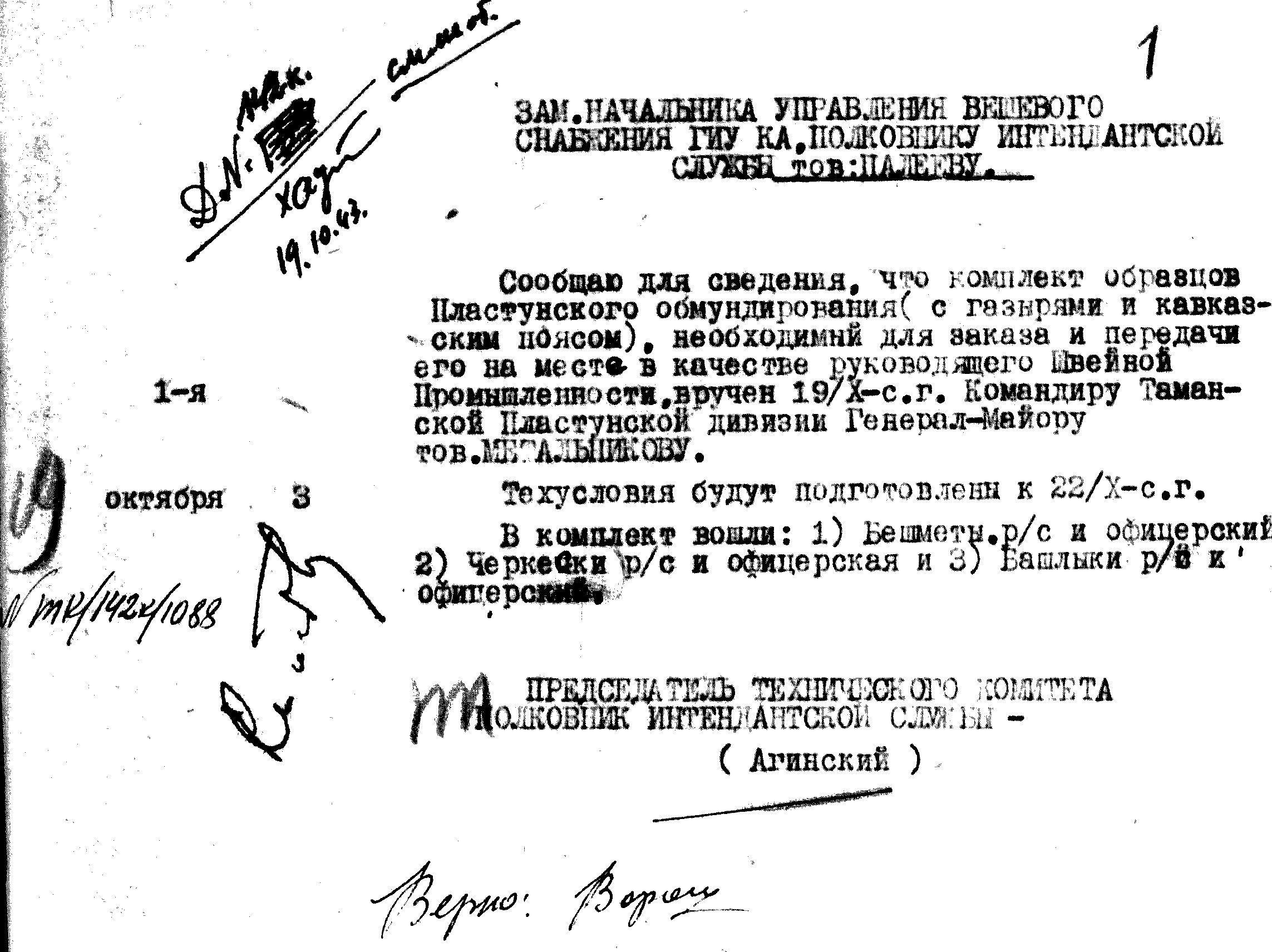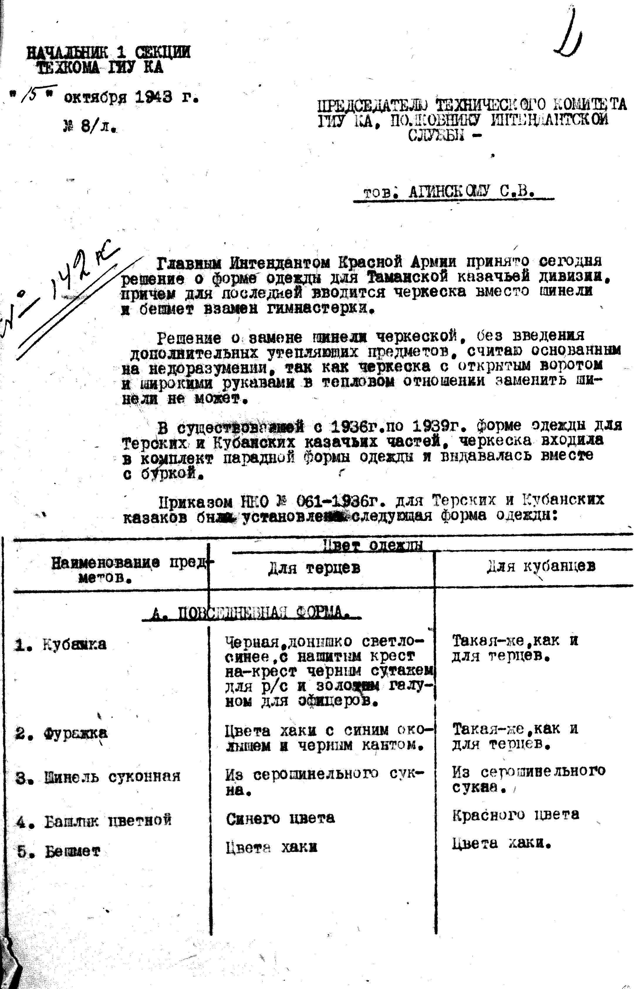 В октябре 1943 г. Главным Интендантом КА было принято решение об установлении особой формы одежды для Таманской казачьей дивизии.