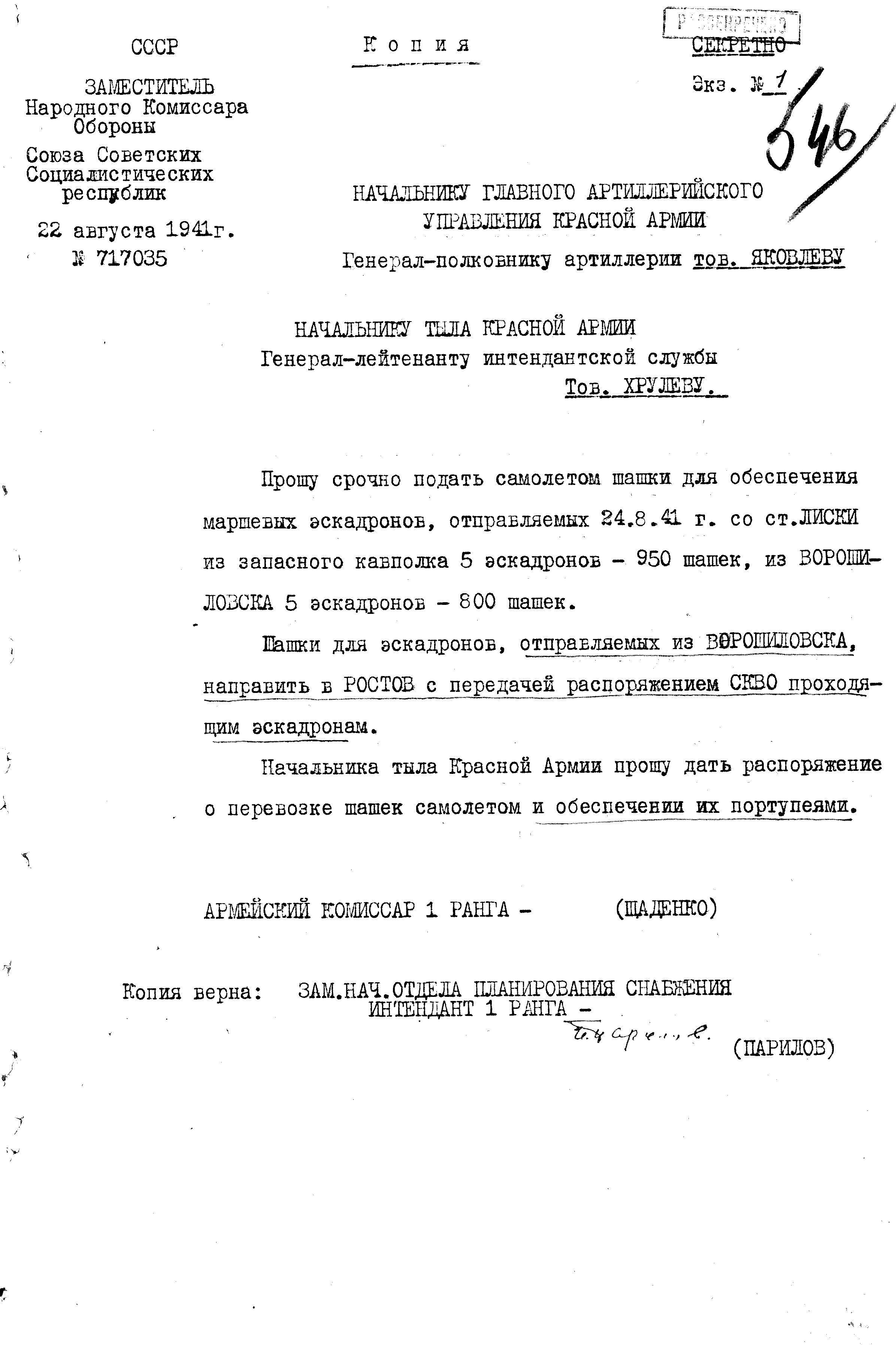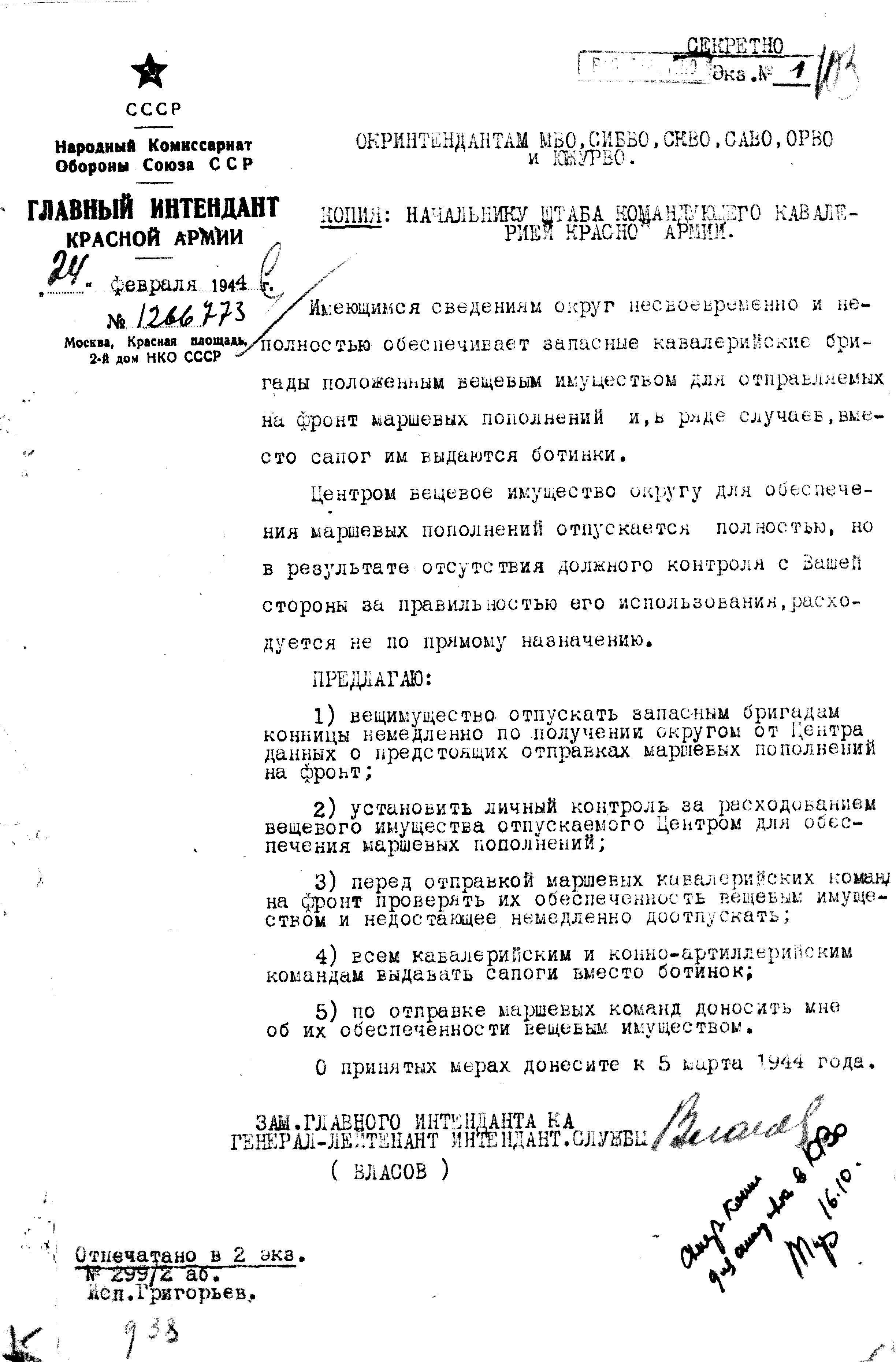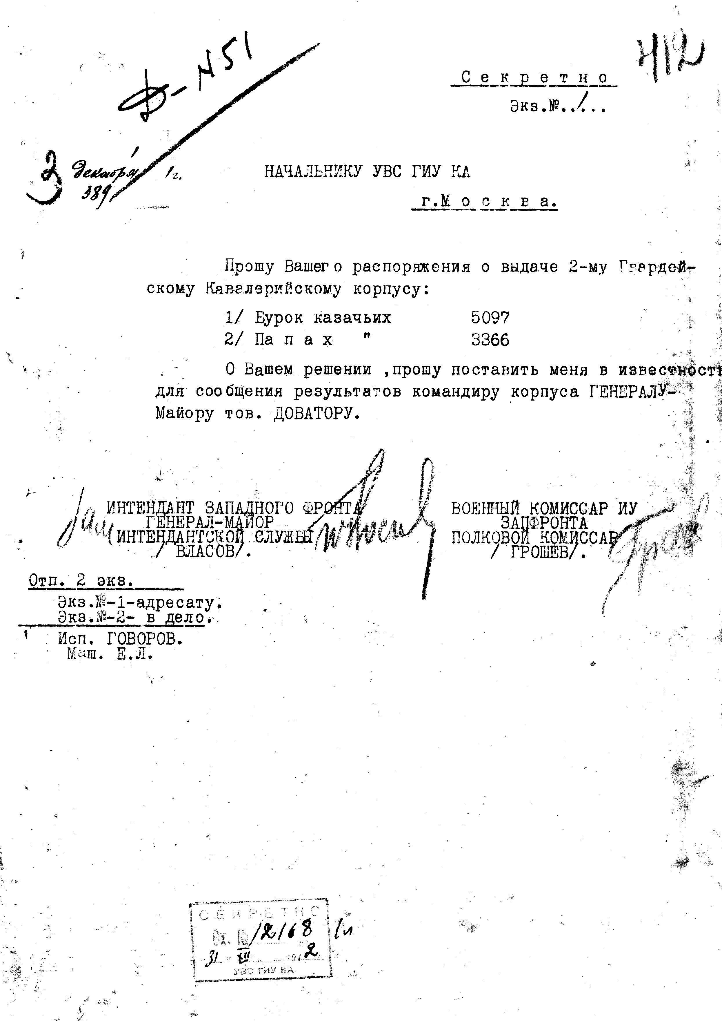 Одним из них был прославленный герой битвы за Москву генерал-майор Л. М.Доватор. Но, Лев Михайлович заботился не только о себе. В архиве сохранился запрос от 3 декабря 1941 г. на выдачу 2-му Гвардейскому Кавалерийскому корпусу, которым он командовал, казачьих бурок и папах.