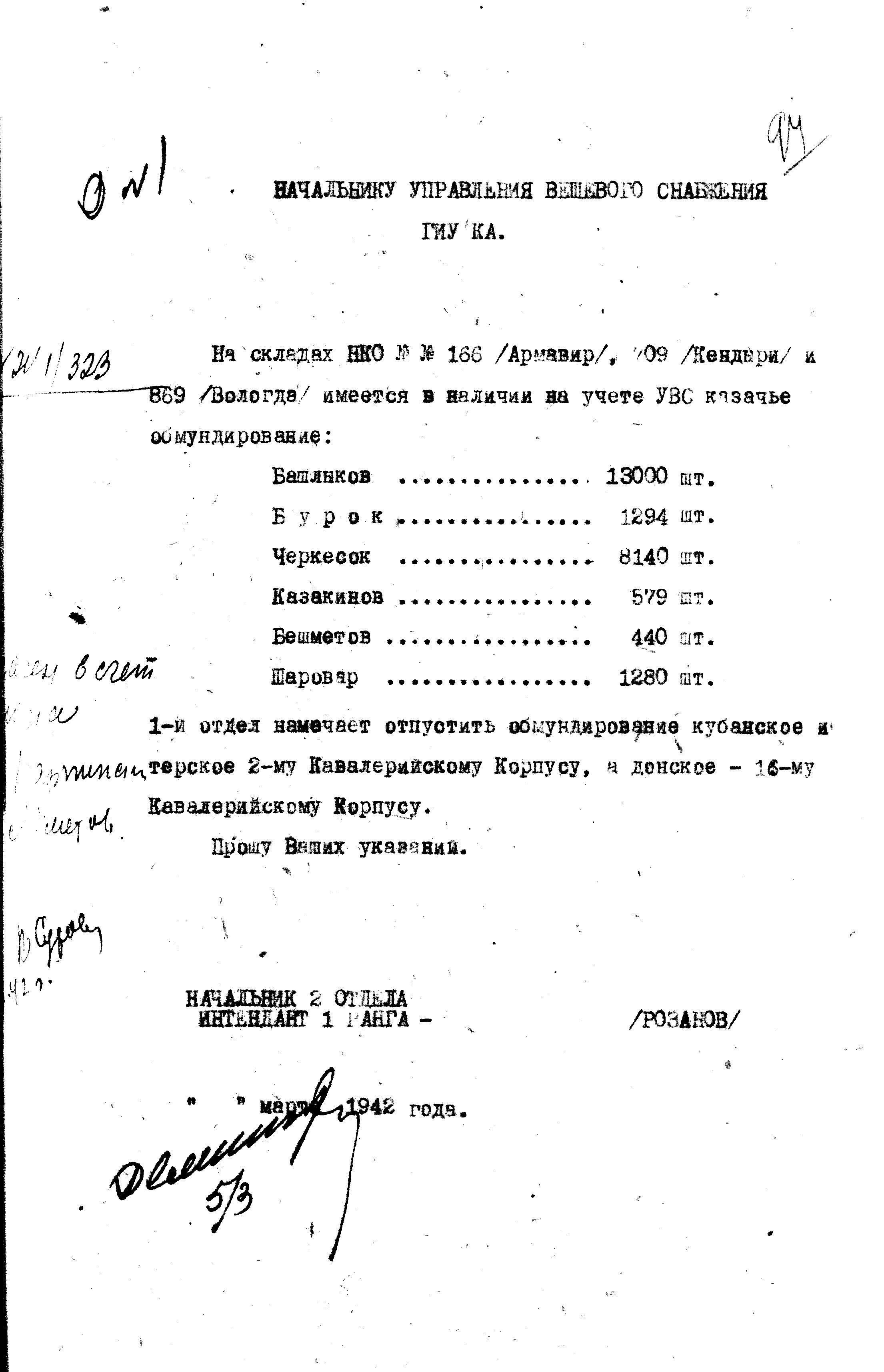 д/с: запрос на выдачу 2-му Гвардейскому Кавалерийскому корпусу казачьего обмундирования.![]()
